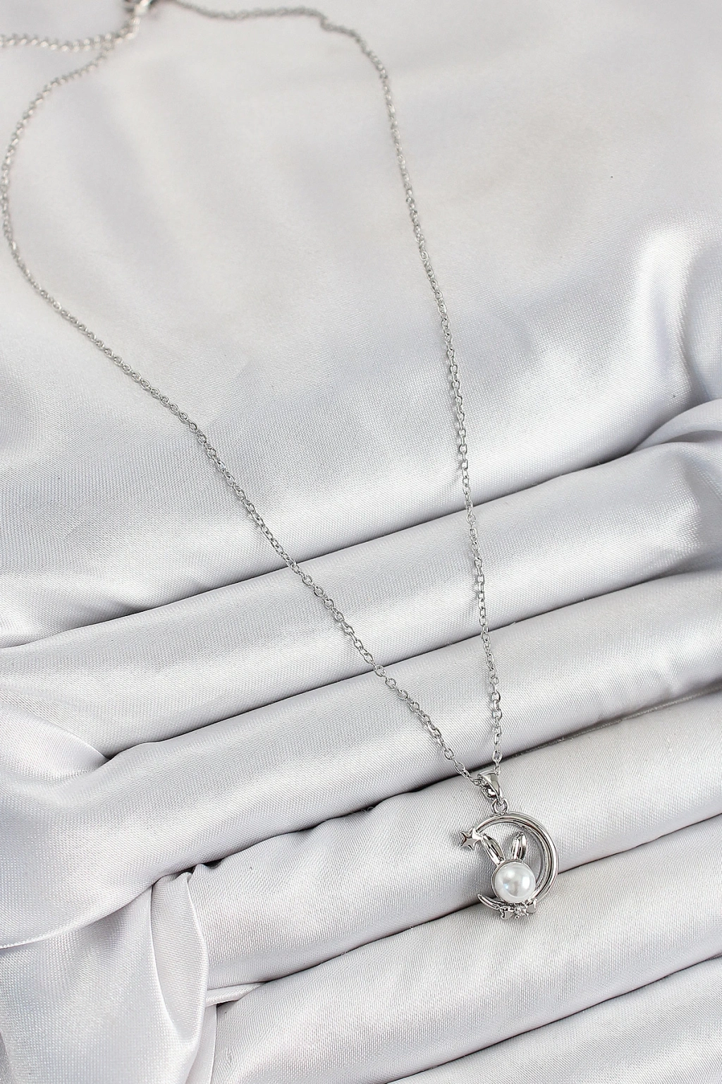 316L Çelik İnci Detaylı Hilal Tavşan Model Gümüş Renk Kadın Kolye - TJ-BKO10348