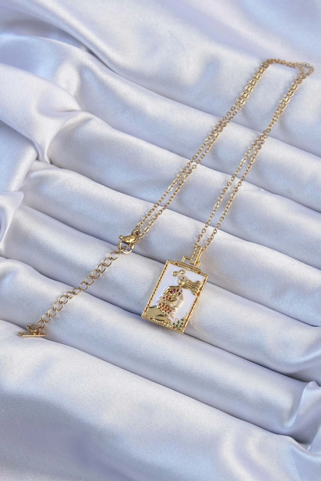 316L Çelik Zincir Altın Renk Beyaz Mineli Tarot Kolye - TJ-BKO9249