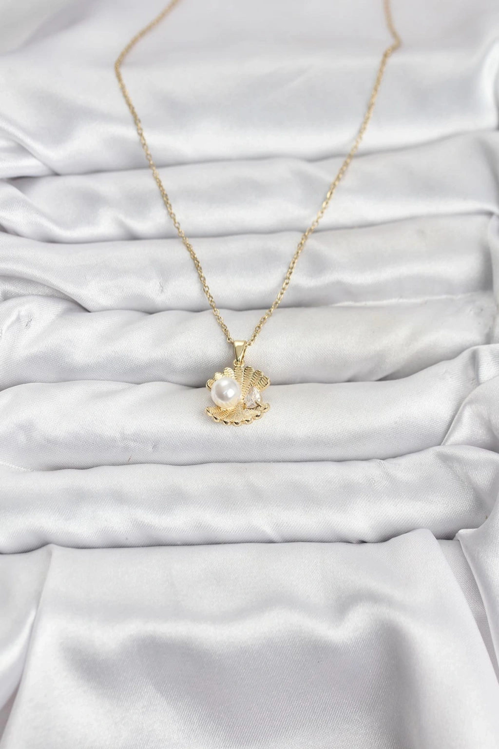 316L Çelik Zincir Gold Renk İstiridye İnci Model Zirkon Taşlı Kadın Kolye - TJ-BKO10850