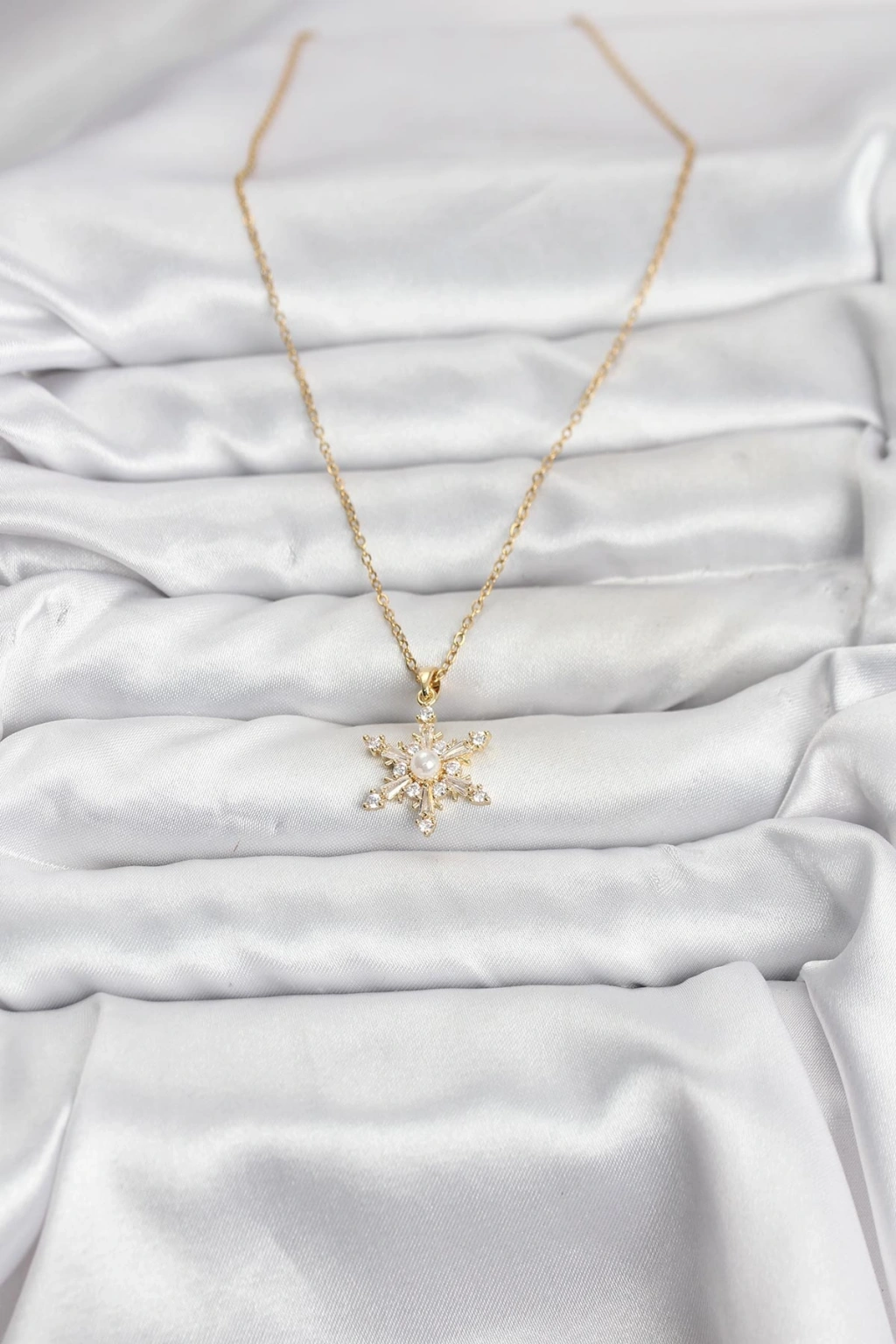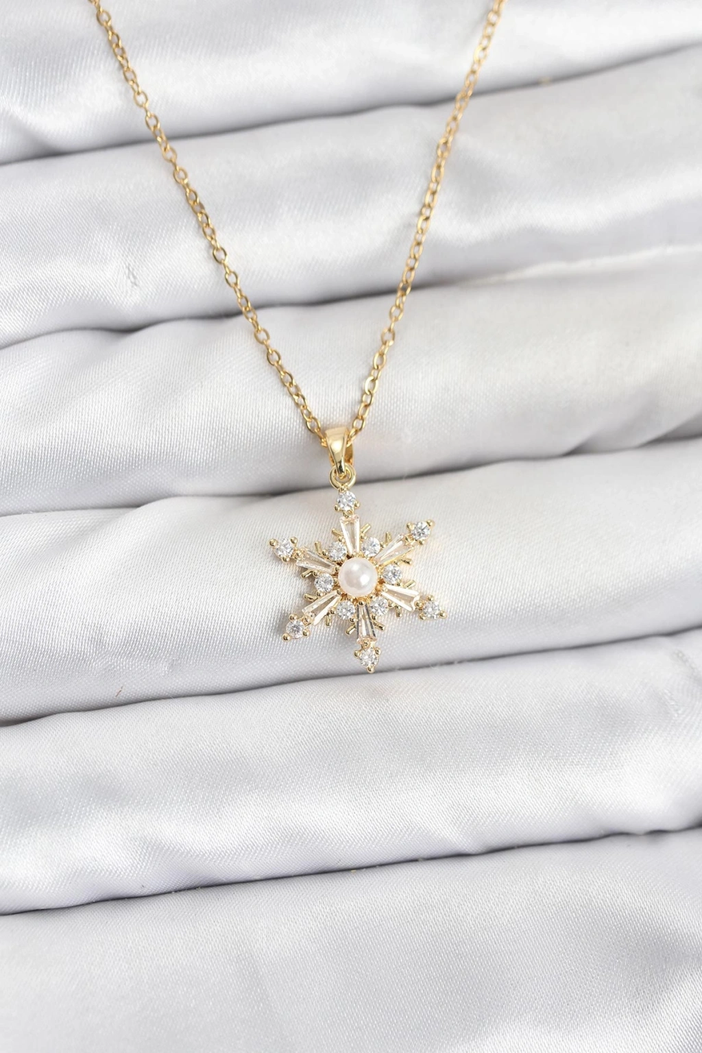 316L Çelik Zincir Gold Renk Kar Tanesi Model Zirkon Taşlı Kadın Kolye - TJ-BKO10865