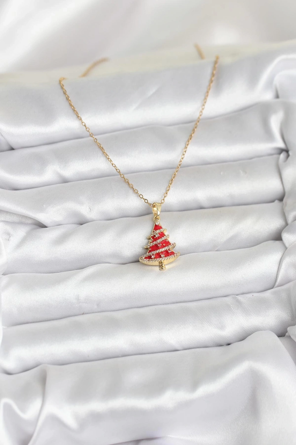 316L Çelik Zincir Gold Renk Kırmızı Çam Ağacı Model Yılbaşı Temalı Kadın Kolye - TJ-BKO10714
