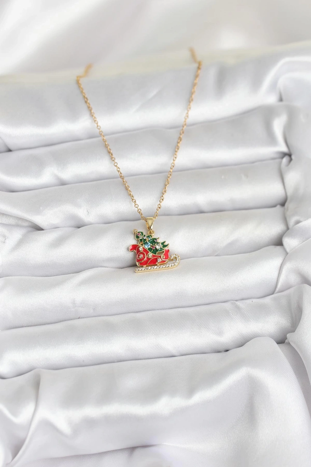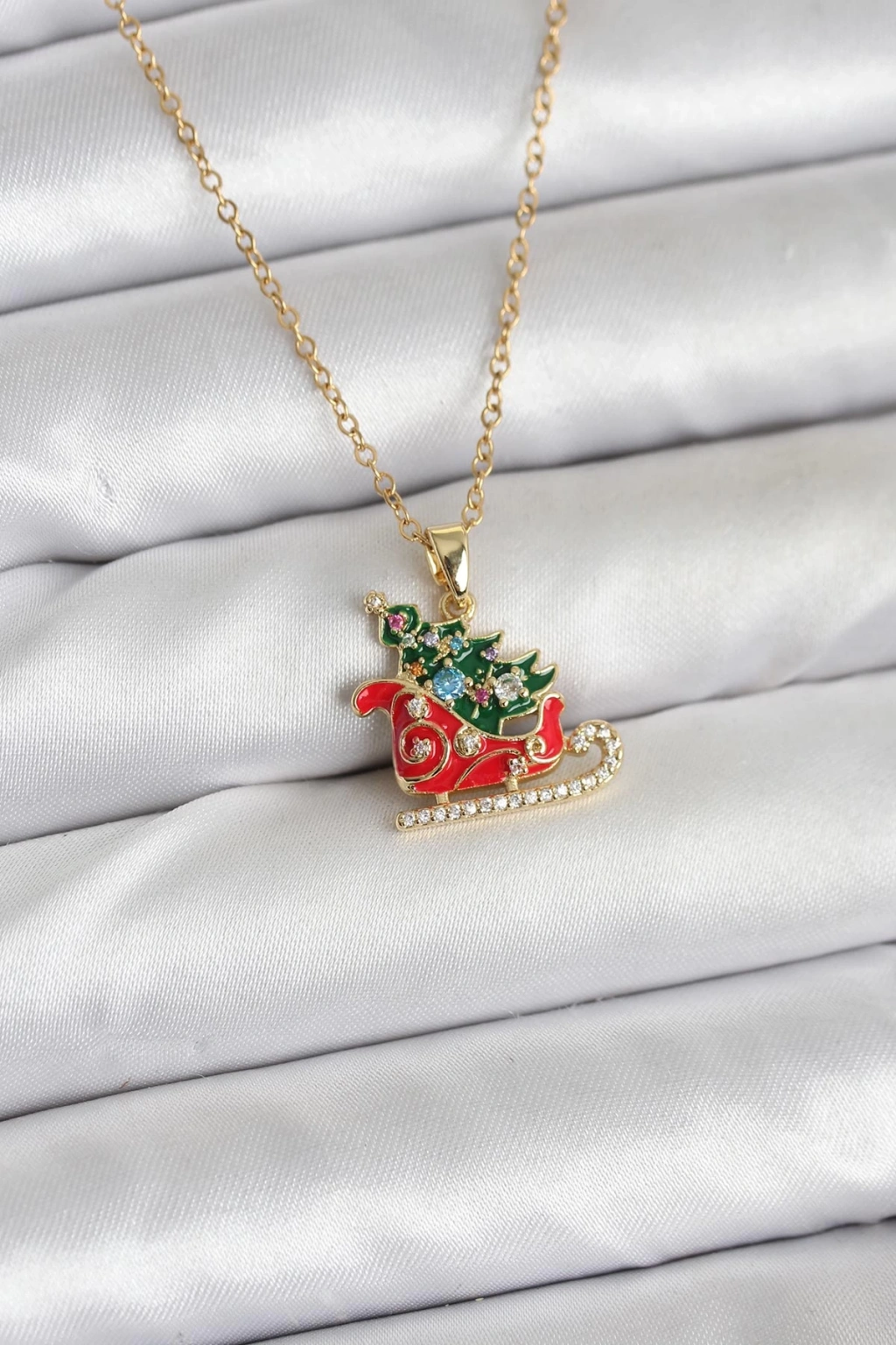 316L Çelik Zincir Gold Renk Kızak ve Çam Ağacı Figürlü Yılbaşı Temalı Kadın Kolye - TJ-BKO10716
