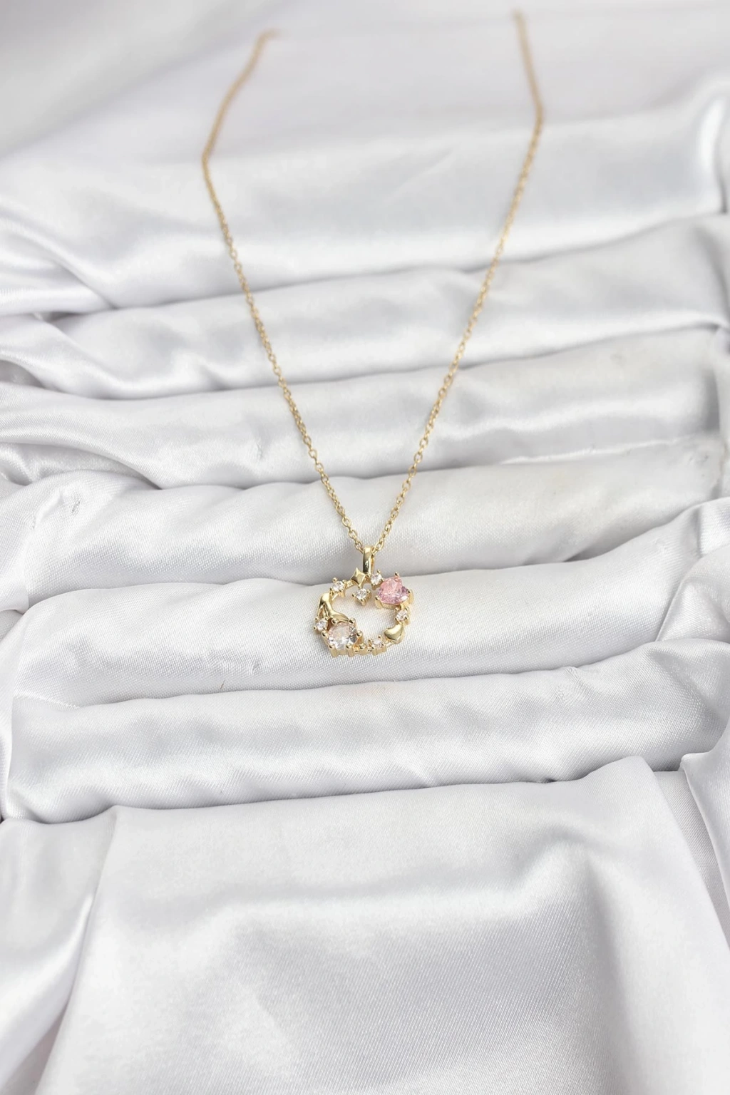 316L Çelik Zincir Gold Renk Pembe Taş Detaylı Çelenk Model Kadın Kolye - TJ-BKO10903