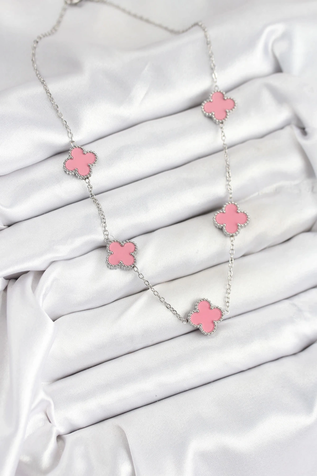 316L Çelik Zincir Gümüş Pembe Renk Yonca Kadın Kolye - TJ-BKO10584