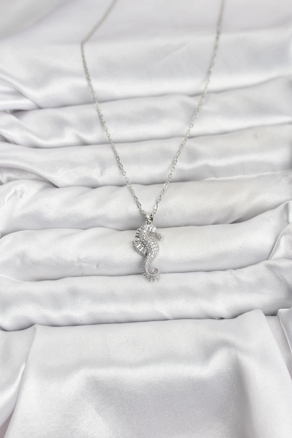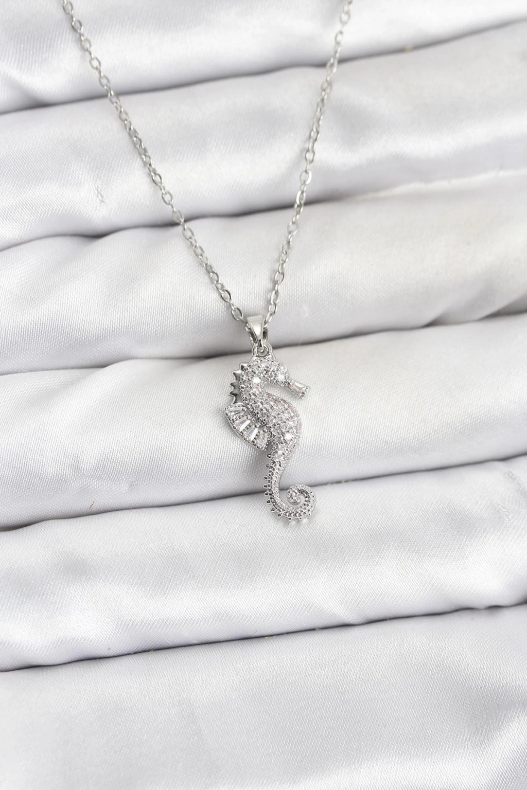 316L Çelik Zincir Gümüş Renk Deniz Atı Model Zirkon Taşlı Kadın Kolye - TJ-BKO10894