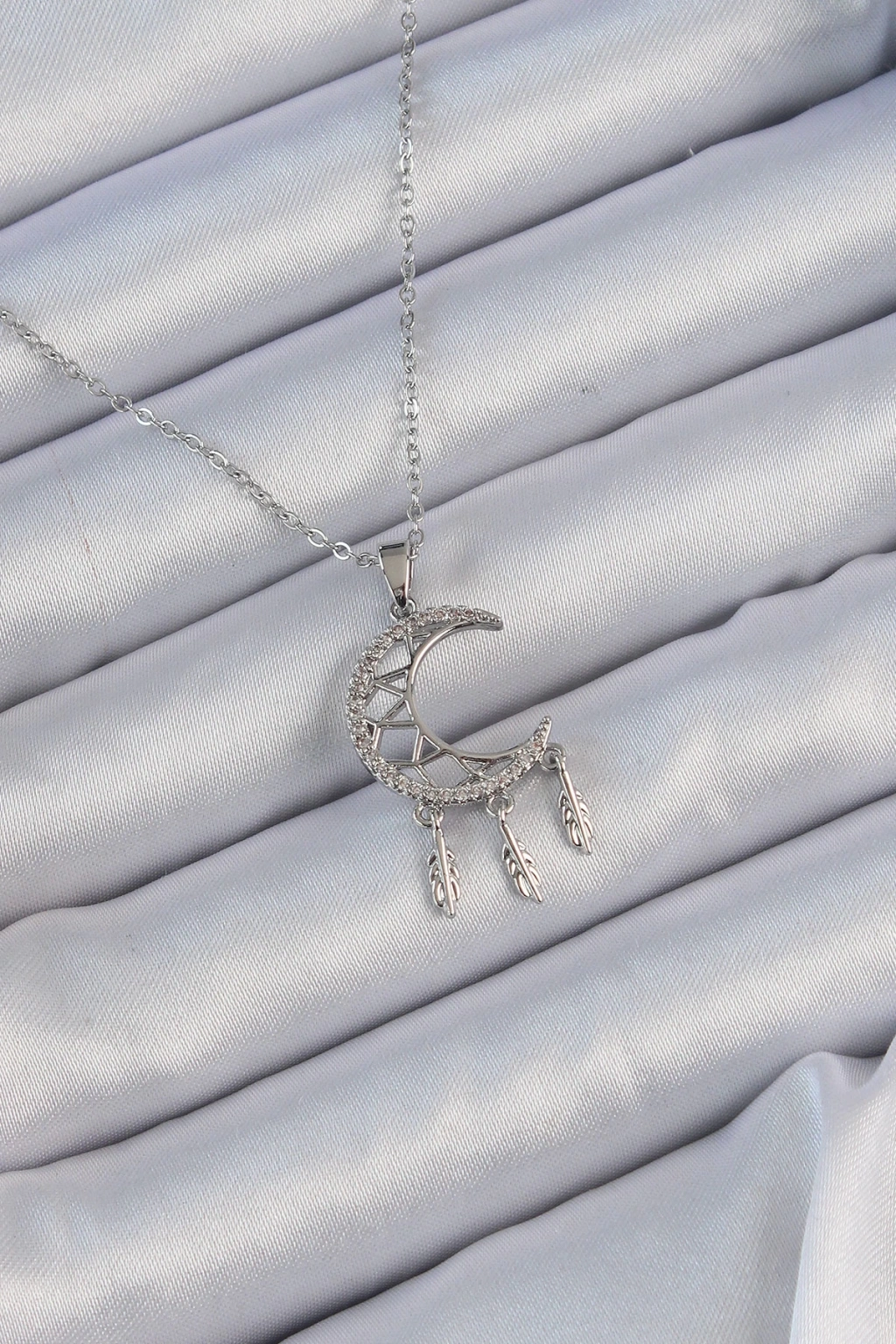 316L Çelik Zincir Gümüş Renk İşlemeli Zirkon Taşlı Ay Kolye - TJ-BKO9172