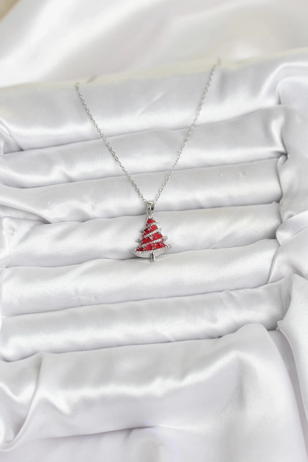 316L Çelik Zincir Gümüş Renk Kırmızı Çam Ağacı Model Yılbaşı Temalı Kadın Kolye - TJ-BKO10715