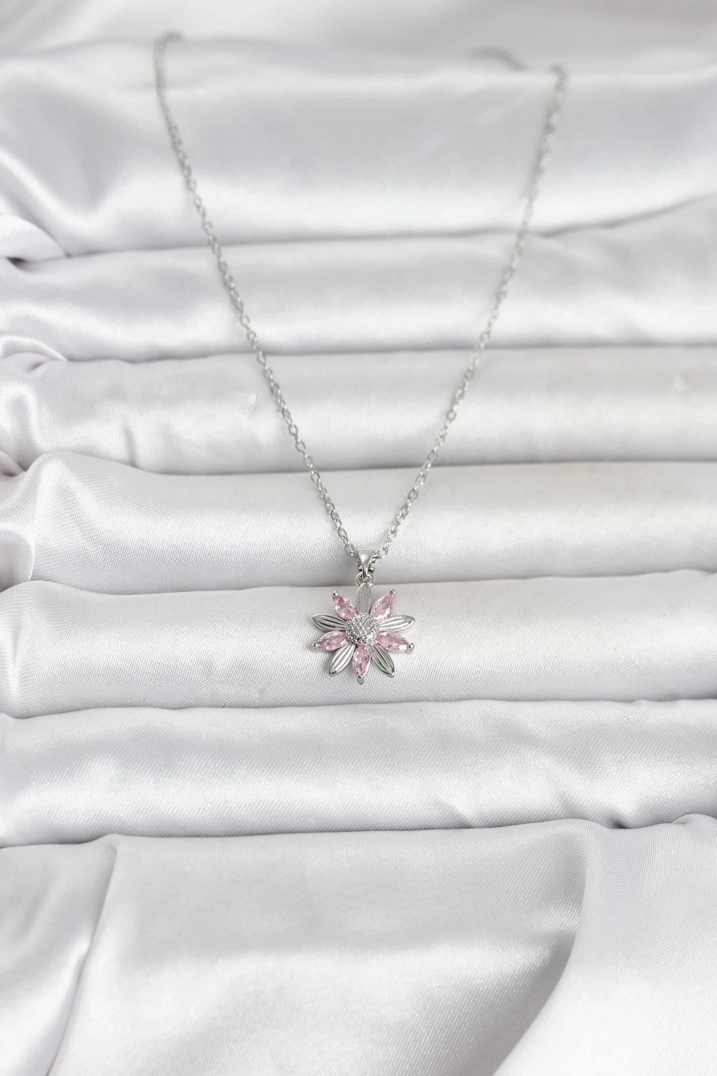 316L Çelik Zincir Gümüş Renk Pembe Papatya Model Kadın Kolye - TJ-BKO11031