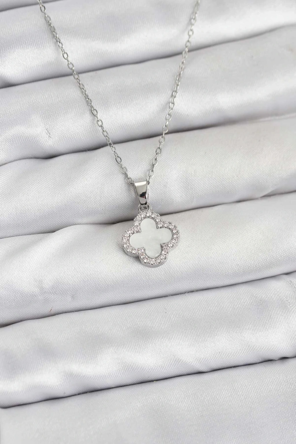 316L Çelik Zincir Gümüş Renk Sedefli Yonca Kadın Kolye - TJ-BKO10766