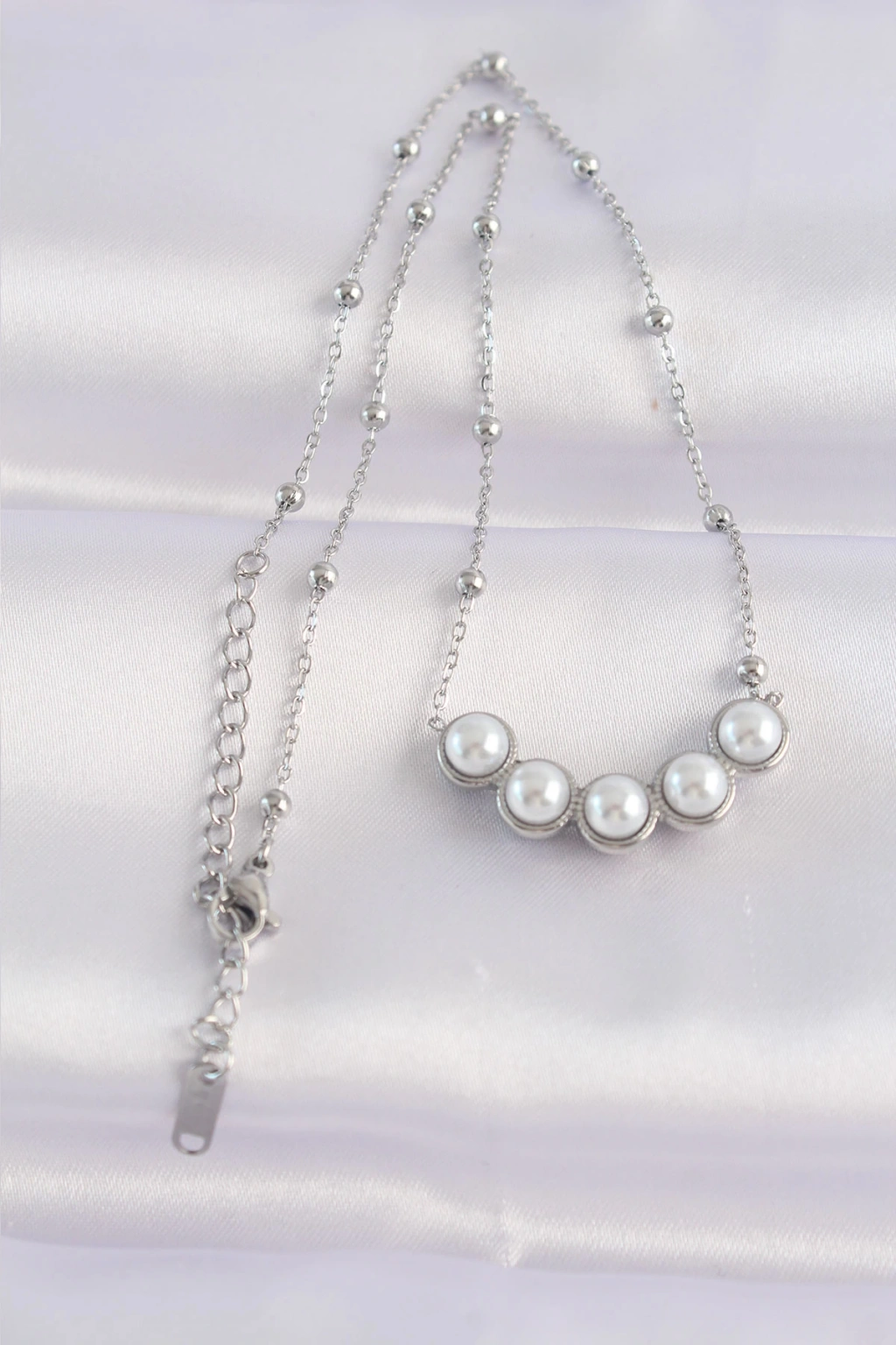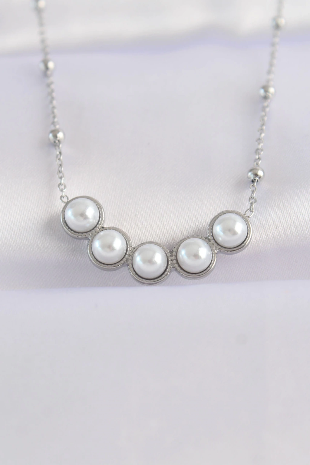 316L Çelik Zincir Gümüş Renk Sıralı İnci Taşlı Kolye - TJ-BKO8654