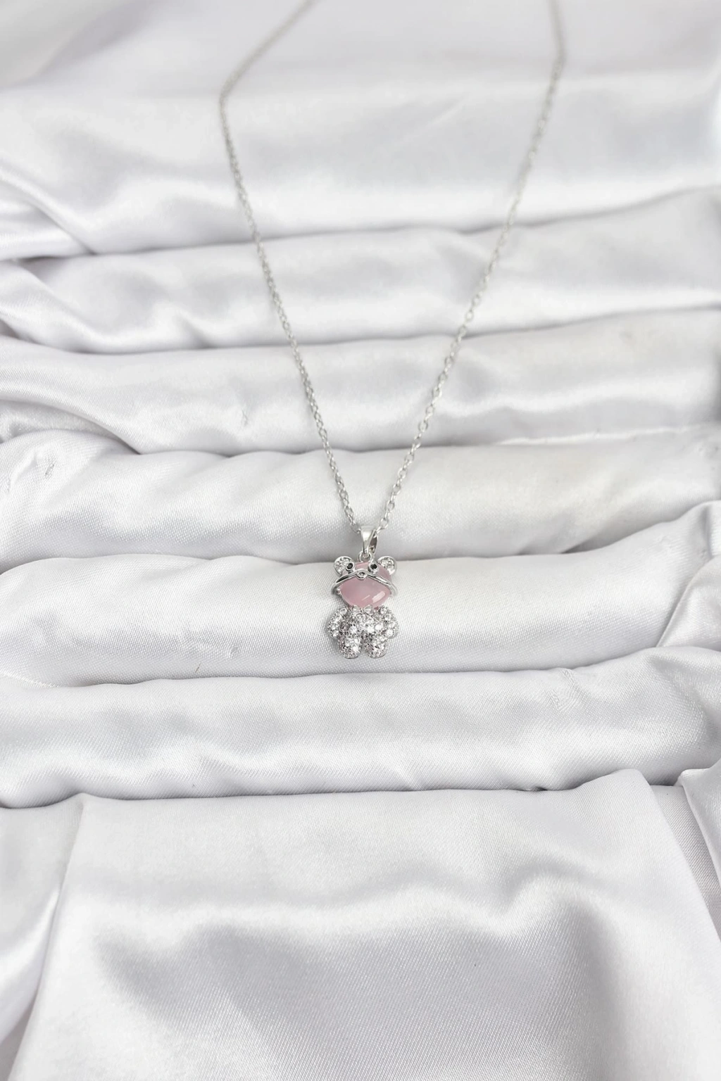 316L Çelik Zincir Gümüş Renk Teddy Bear Model Zirkon Taşlı Kadın Kolye - TJ-BKO10853