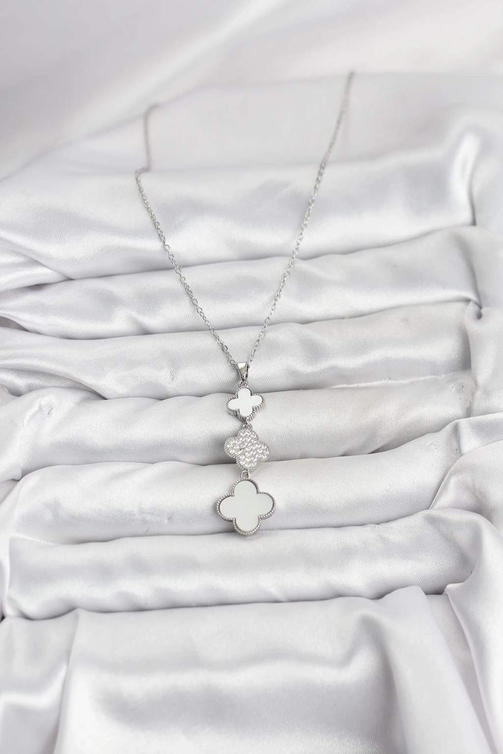 316L Çelik Zincir Gümüş Renk Yonca Detaylı Zirkon Taşlı Kadın Kolye - TJ-BKO10828