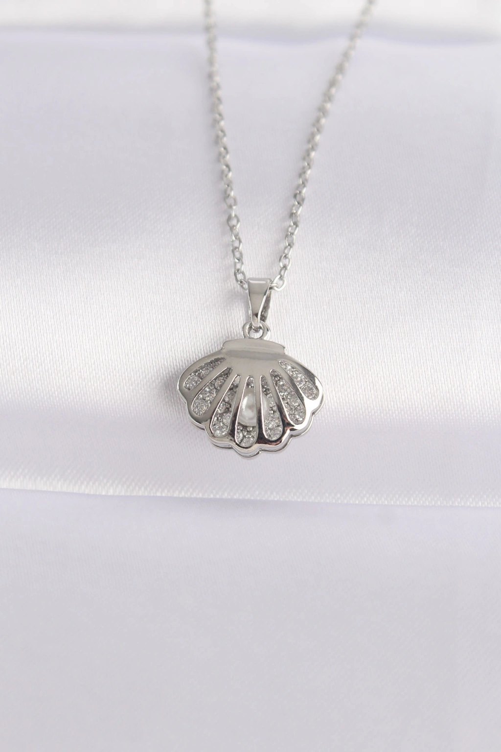 316L Çelik Zincir Gümüş Renk Zirkon Taşlı İnci Detay İstiridye Kolye - TJ-BKO8600