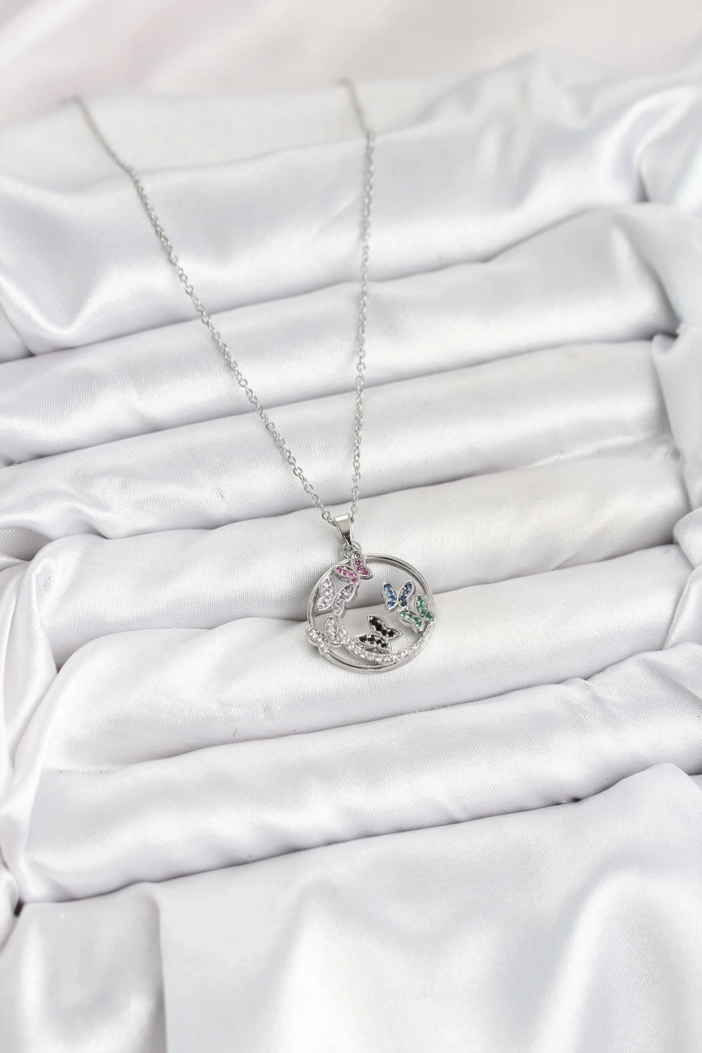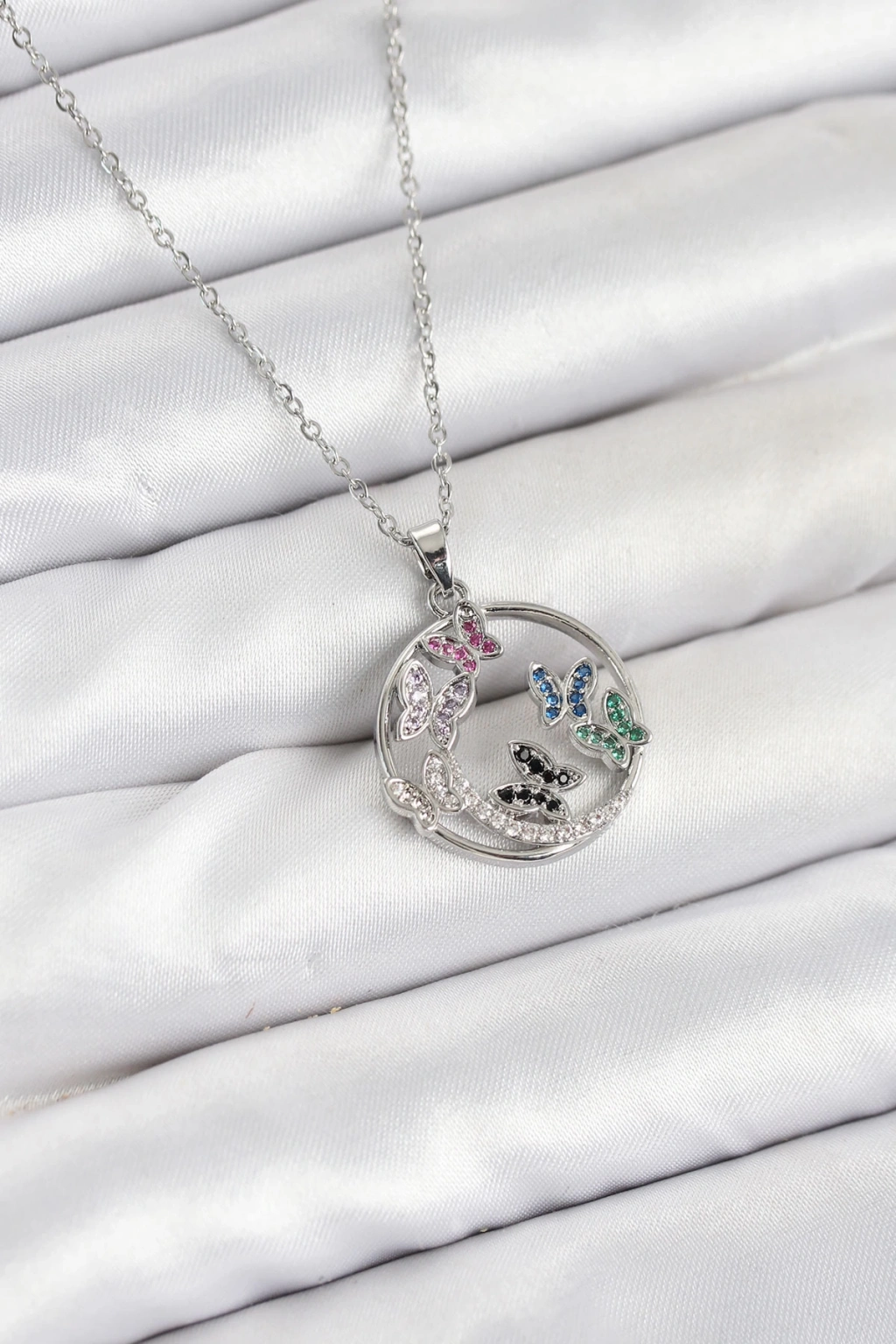 316L Çelik Zincir Gümüş Renk Zirkon Taşlı Kelebekli Kadın Kolye - TJ-BKO10608