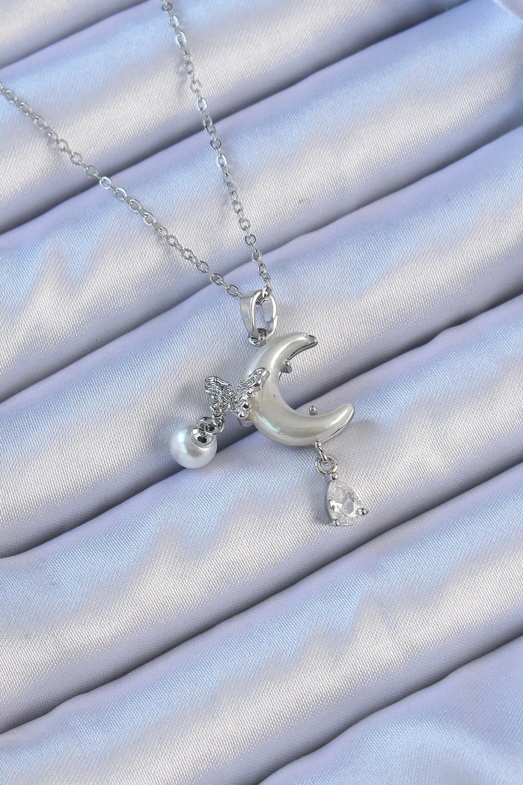 316L Çelik Zincir Gümüş Renk Zirkon Taşlı Kelebekli Mineli Ay Kolye - TJ-BKO9094