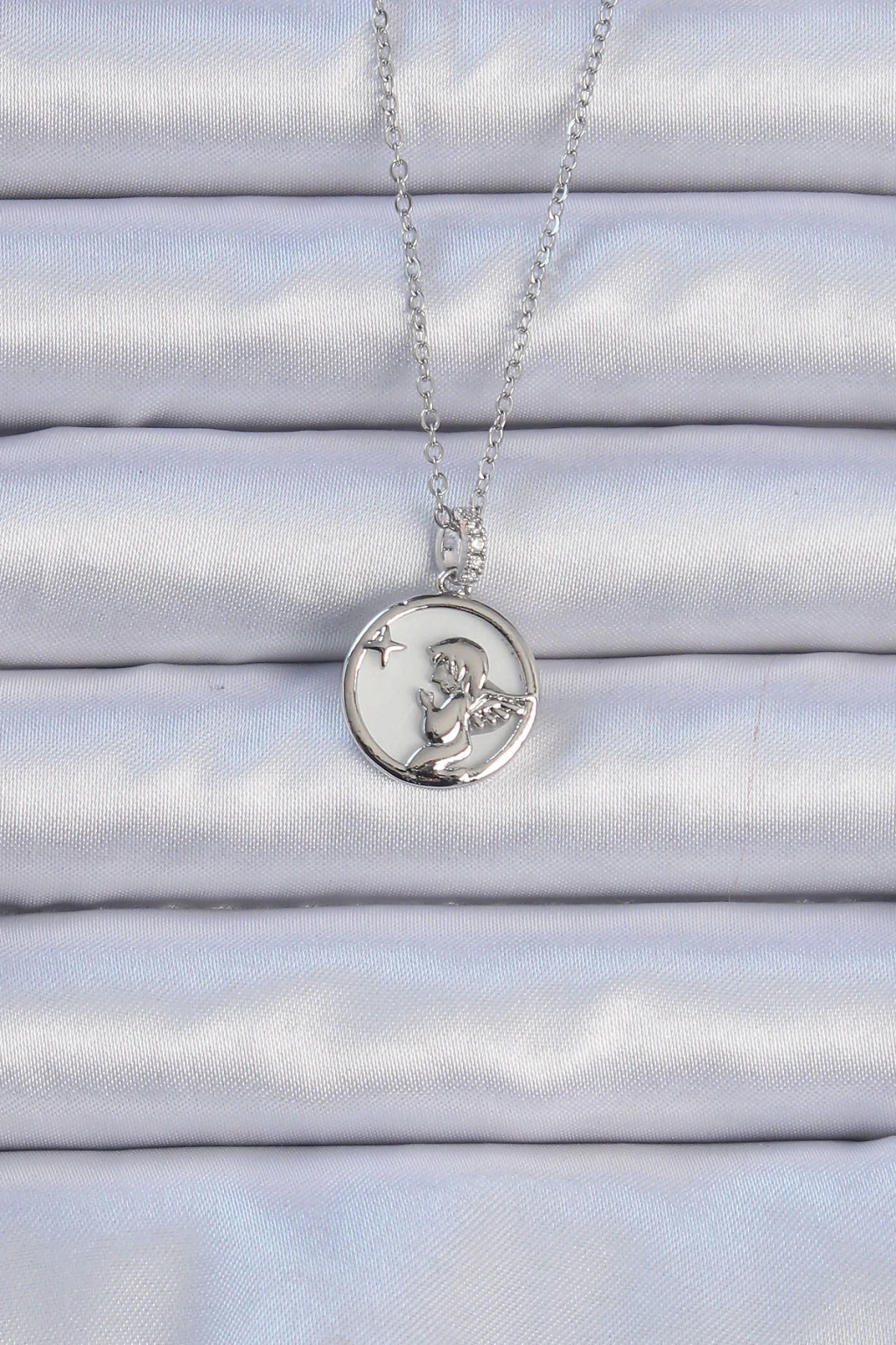 316L Çelik Zincir Gümüş Renk Zirkon Taşlı Mineli Melek Kolye - TJ-BKO9086