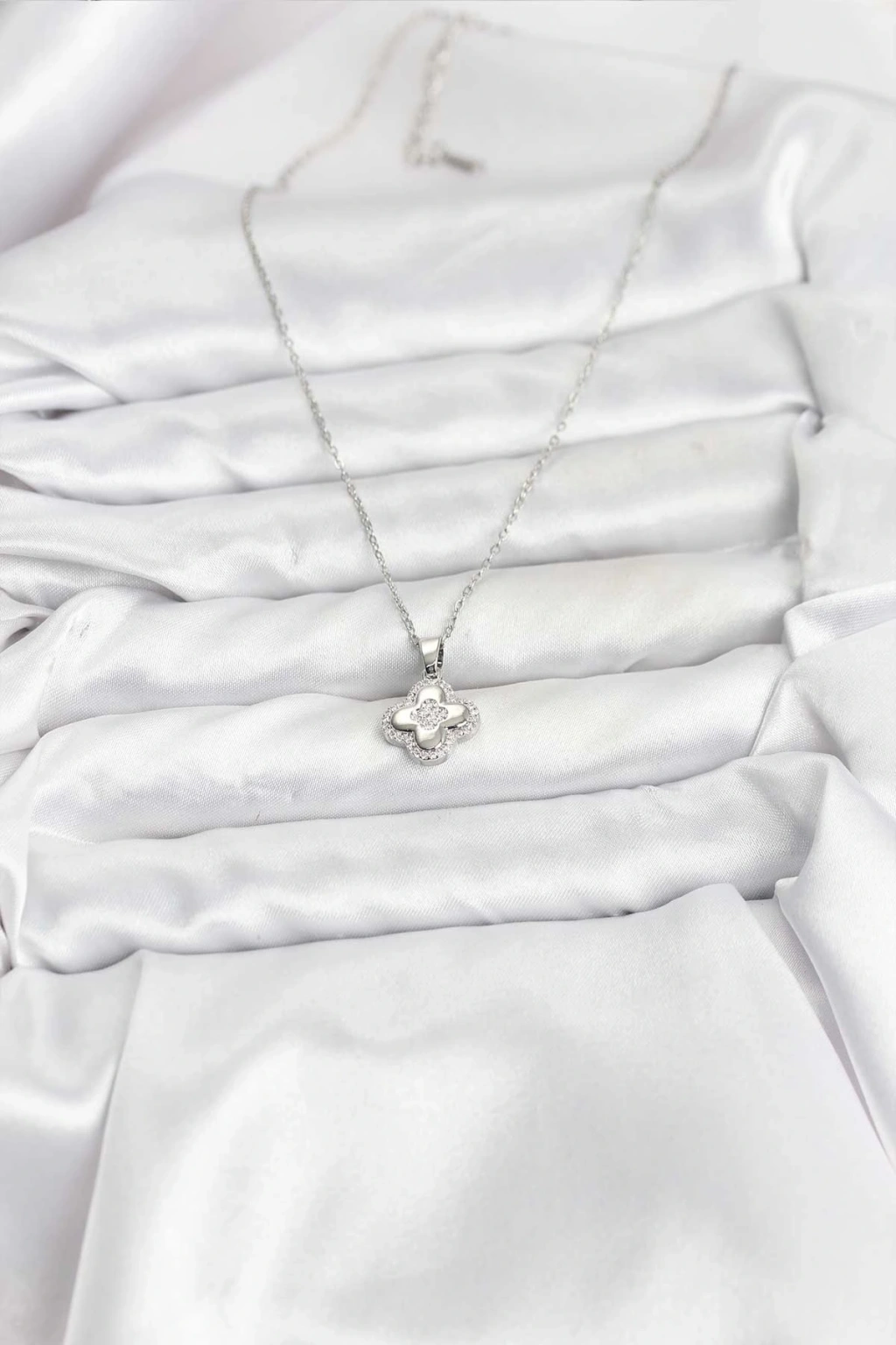 316L Çelik Zincir Gümüş Renk Zirkon Taşlı Yonca Model Kadın Kolye - TJ-BKO10768