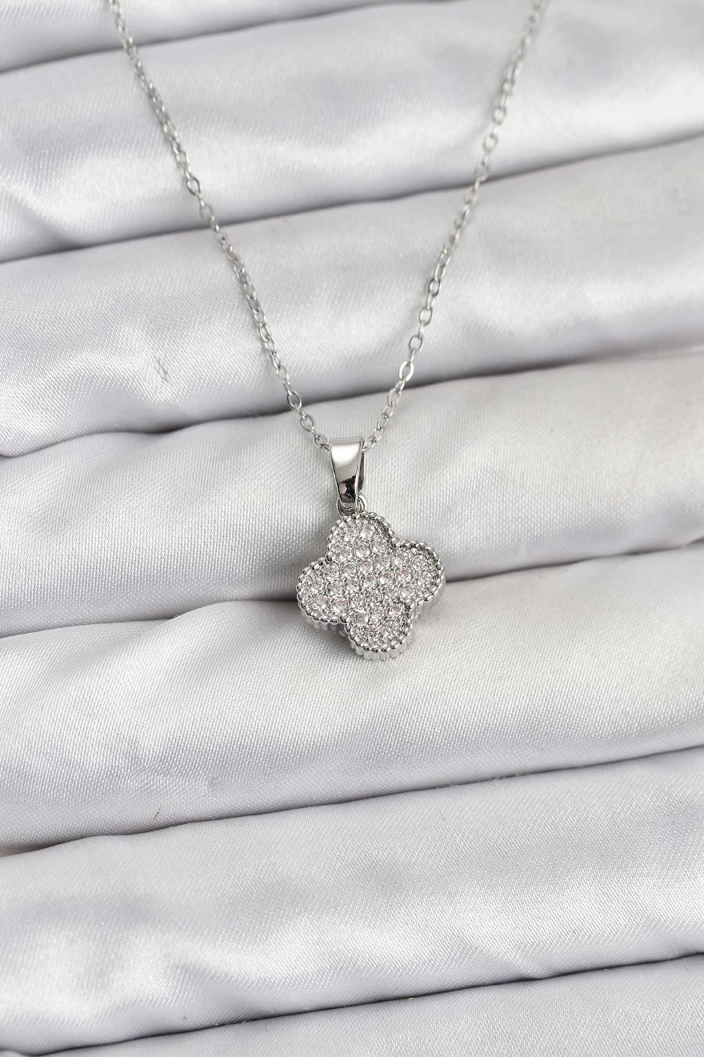 316L Çelik Zincir Gümüş Renk Zirkon Taşlı Yonca Model Kadın Kolye - TJ-BKO10772