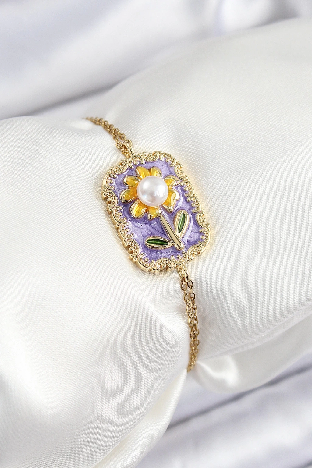 316L Çelik Zincir Mor Mineli Sanatsal Portre İnci Detaylı Papatya Model Gold Renk Kadın Bileklik - TJ-BB7231