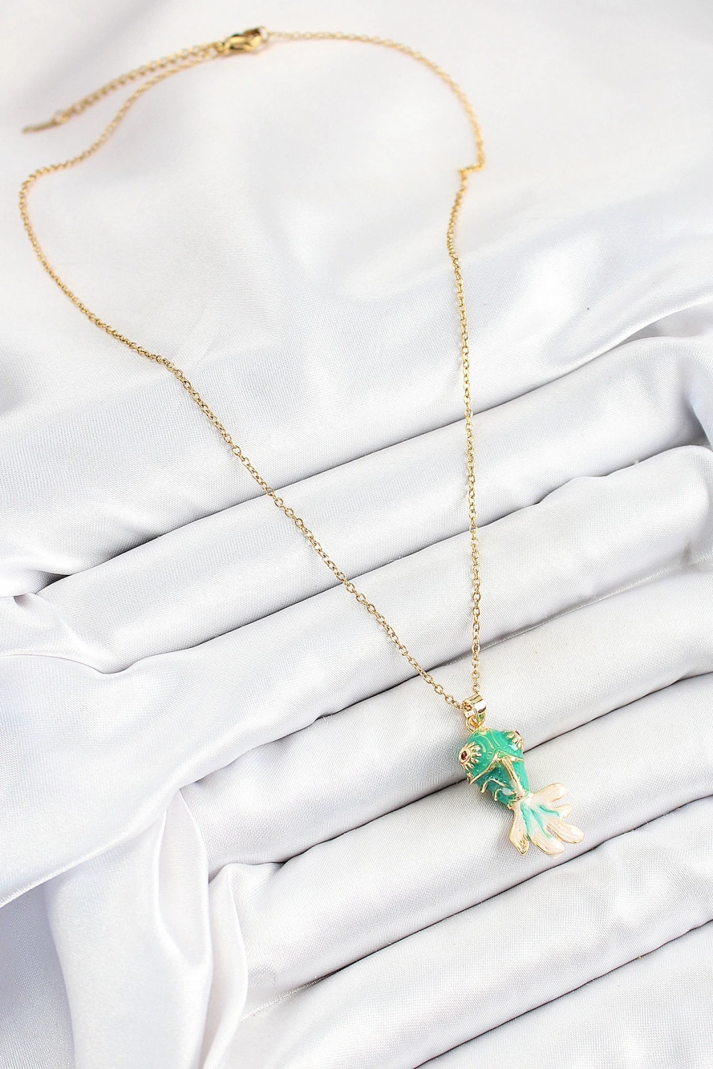 316L Çelik Zincir Yeşil Balık Model Gold Renk Kadın Kolye - TJ-BKO10323