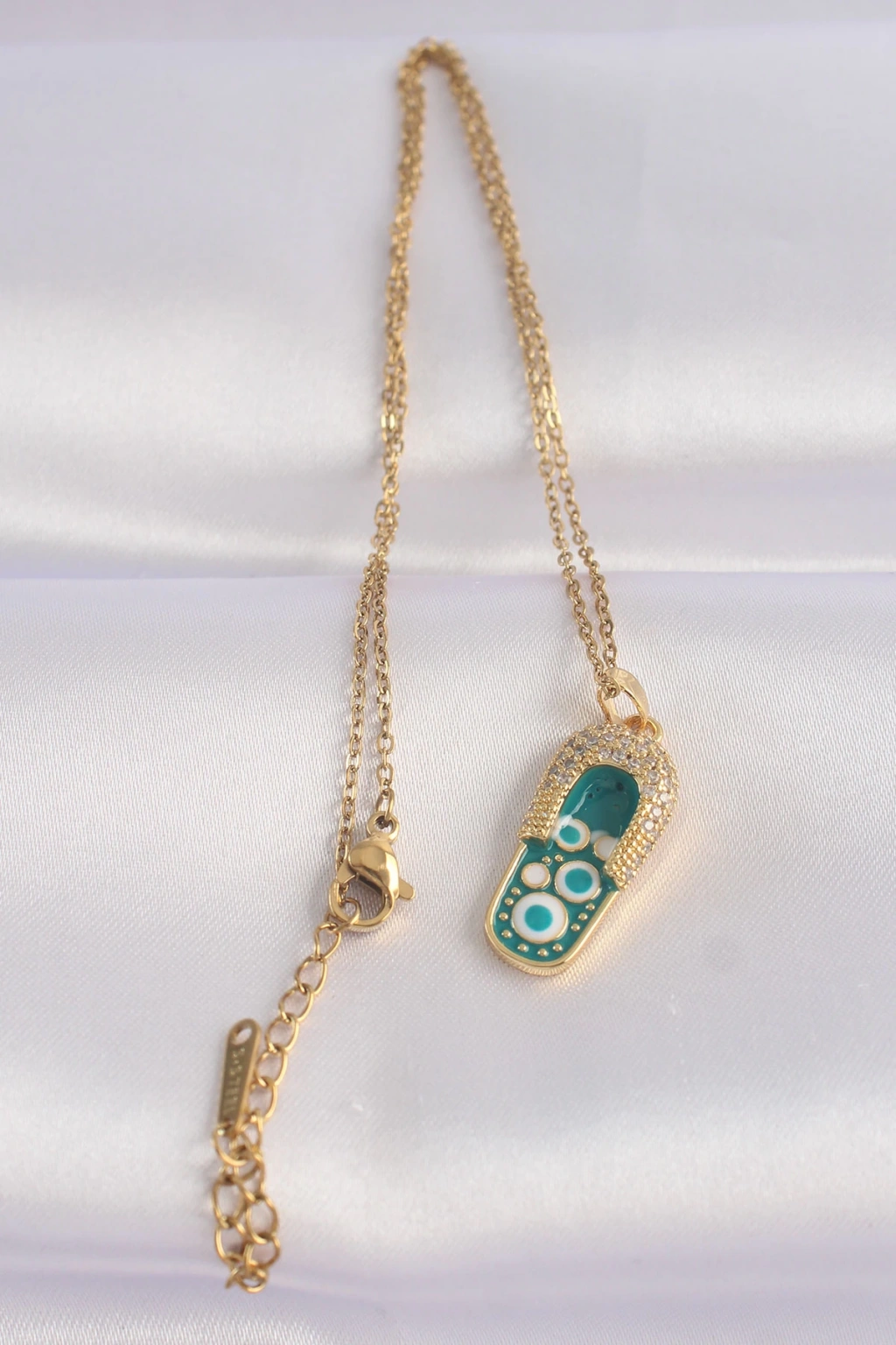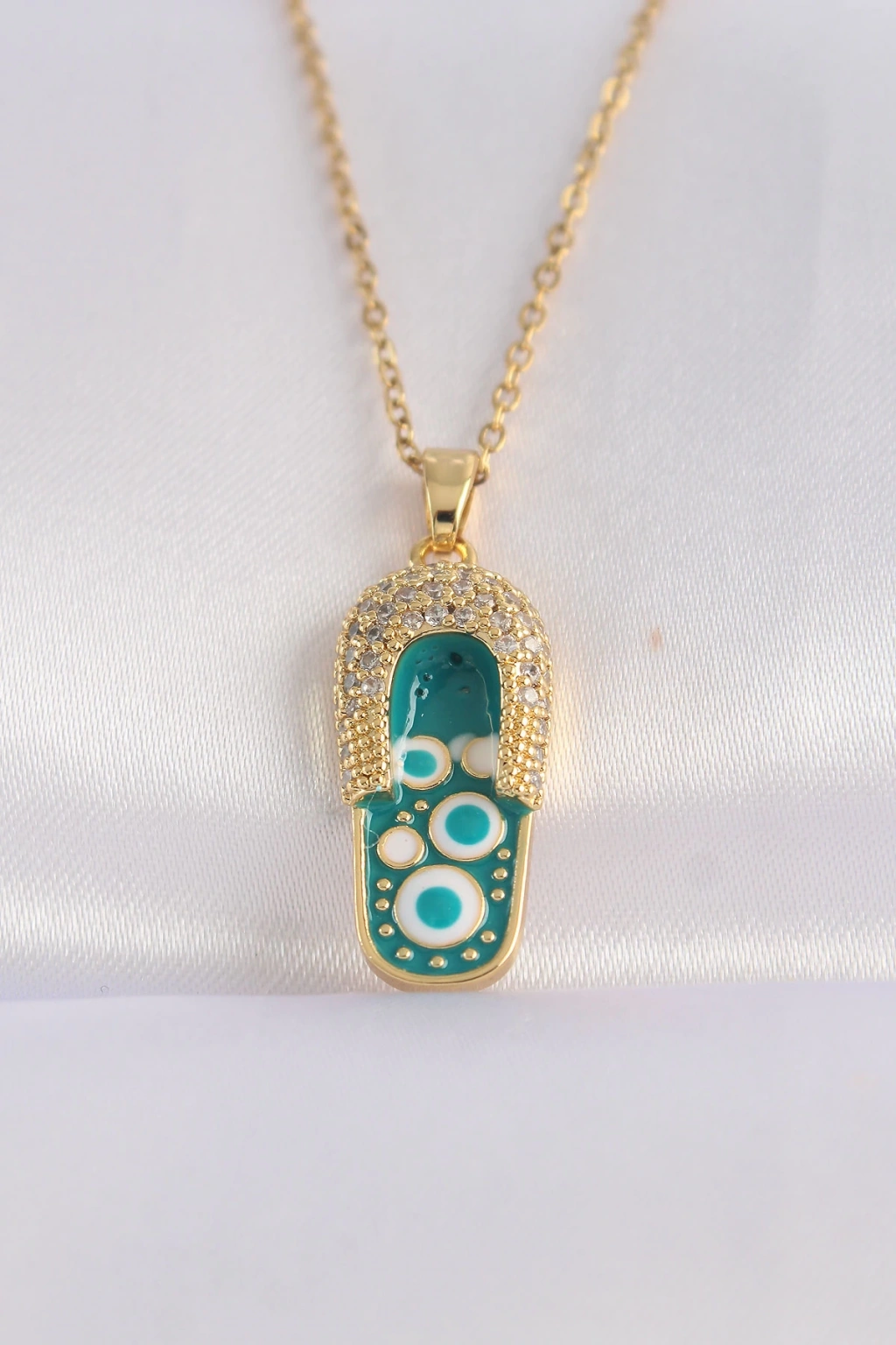 316L Çelik Zincir Zirkon Taşlı Altın Renk Nazarlı Terlik Tasarımlı Kolye - TJ-BKO8664