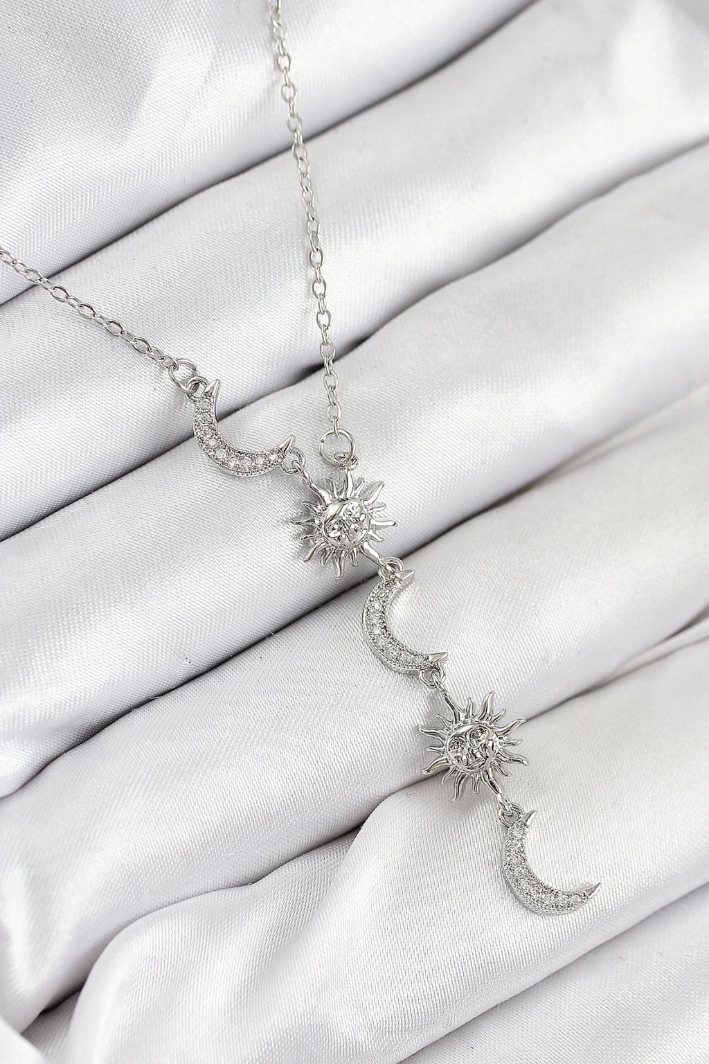 316L Çelik Zirkon Taşlı Güneş Ve Ay Model Gümüş Renk Kadın Kolye - TJ-BKO10549