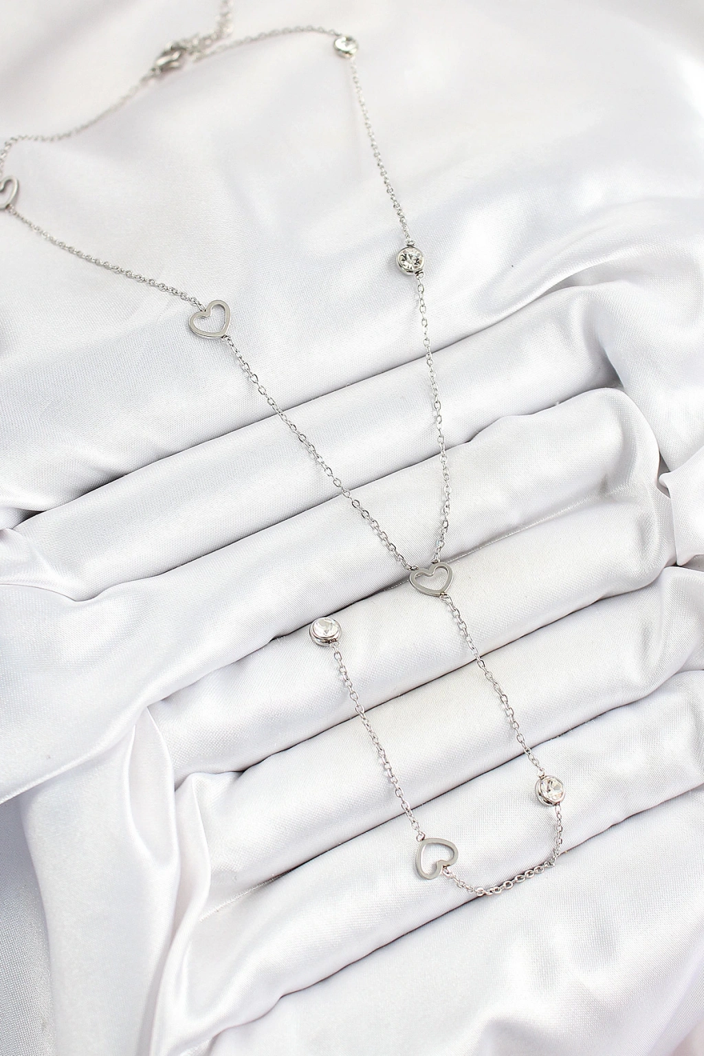 316L Çelik Zirkon Taşlı Kalp Figürlü Y Model Gümüş Renk Kadın Kolye - TJ-BKO10334