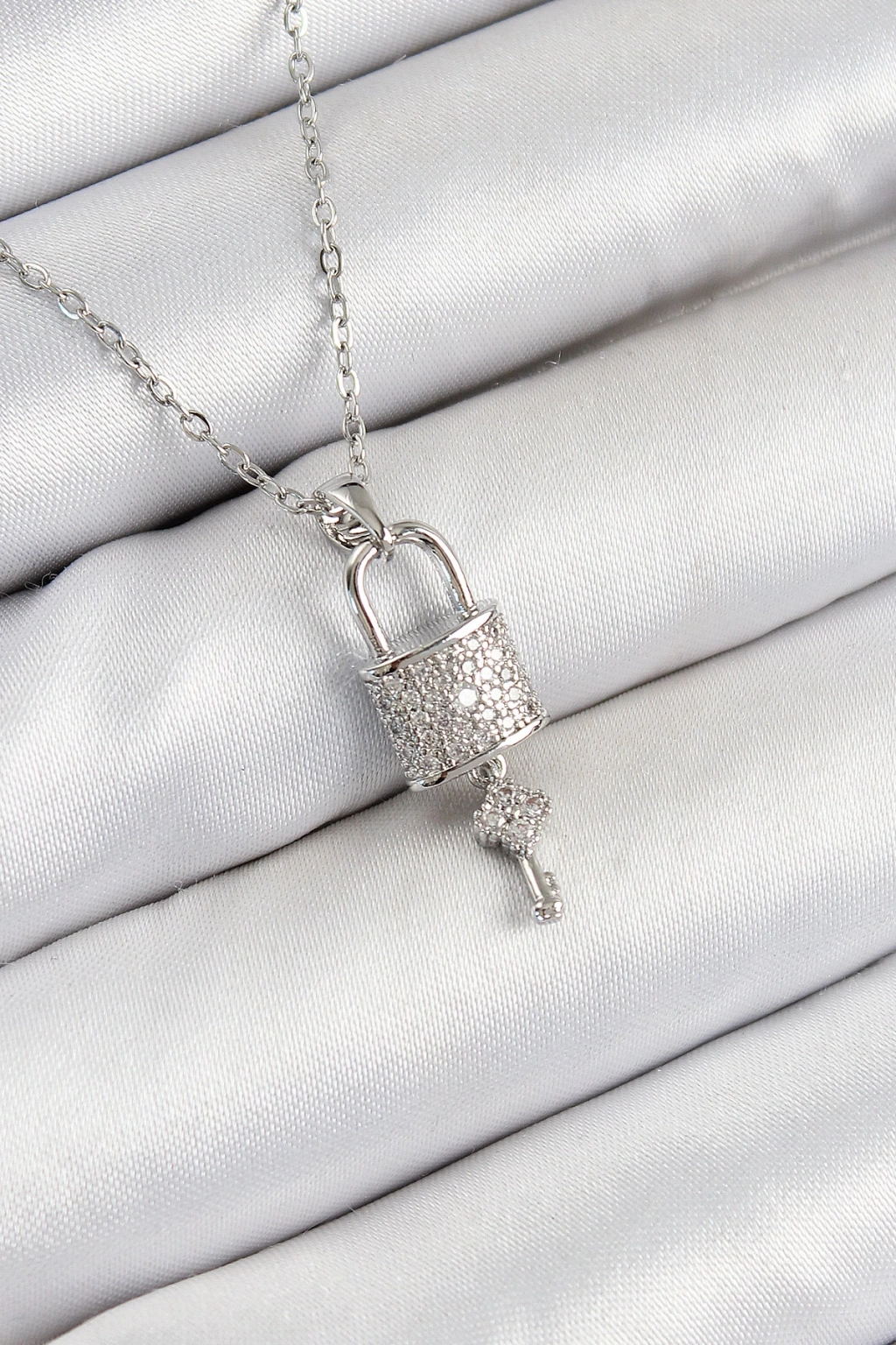 316L Çelik Zirkon Taşlı Kilit Ve Sallantılı Anahtar Model Gümüş Renk Kadın Kolye - TJ-BKO10354