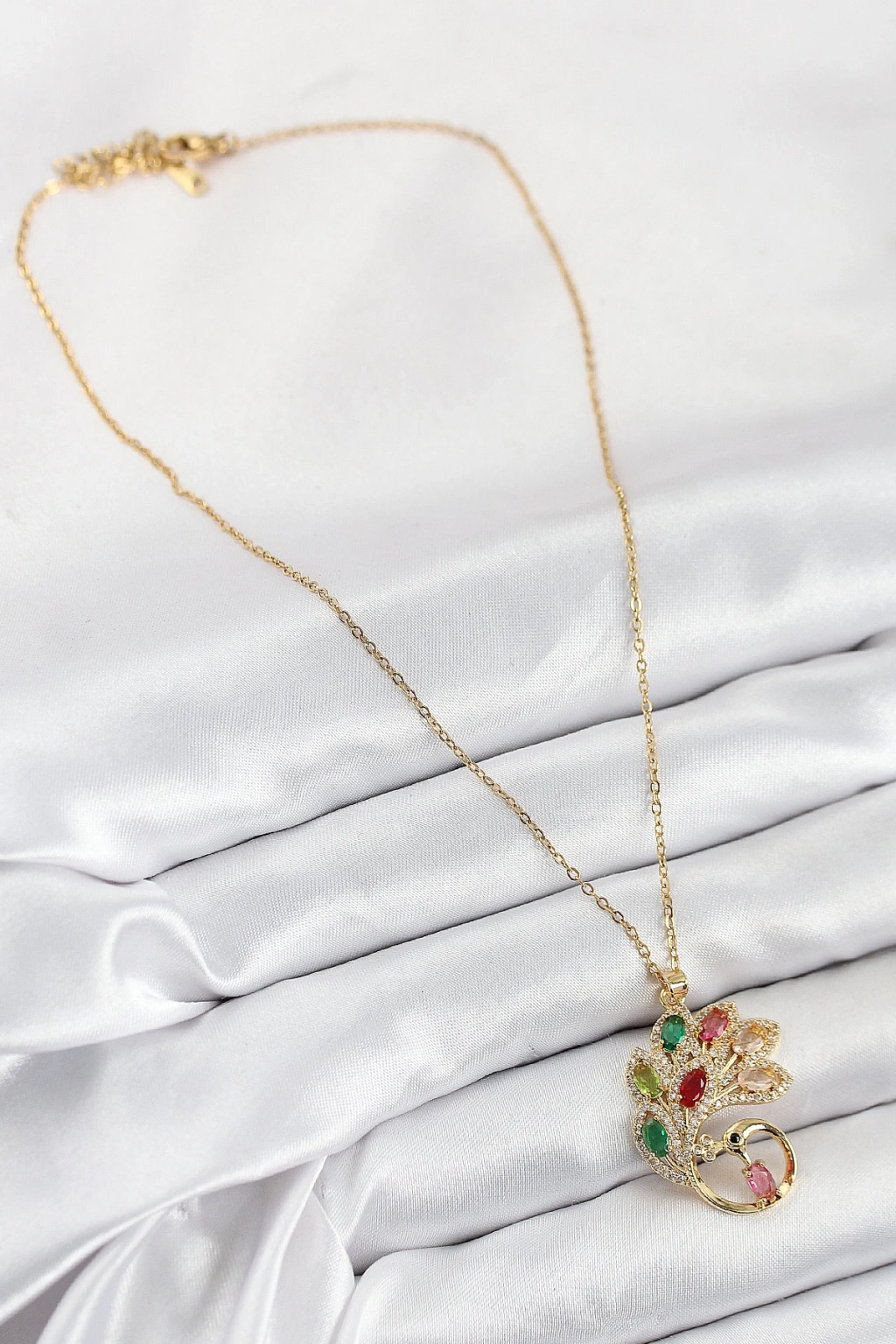 316L Çelik Zirkon Taşlı Tavus Kuşu Model Gold Renk Kadın Kolye - TJ-BKO10514
