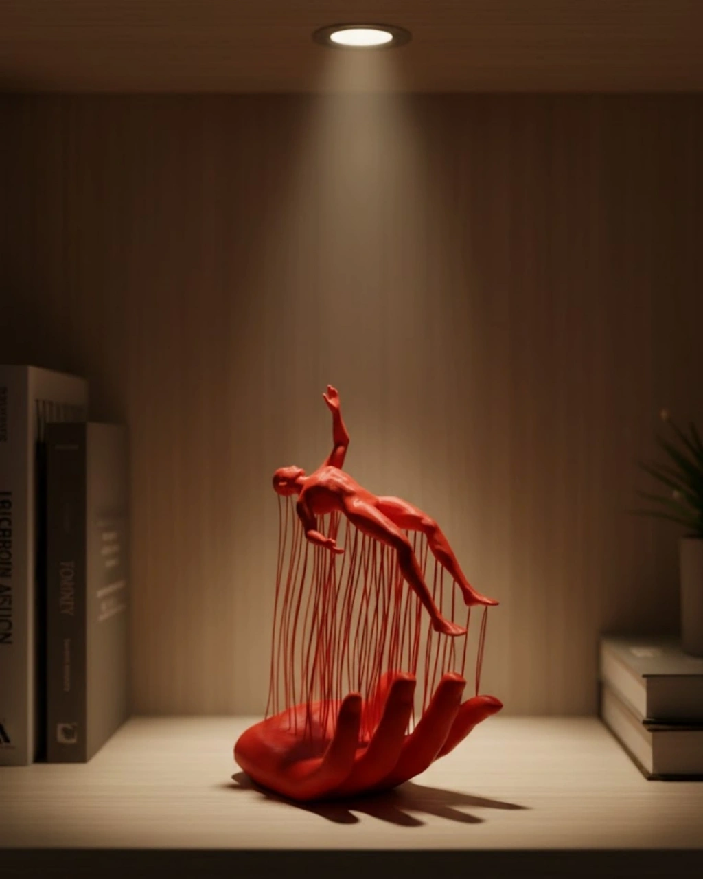 Sanatsal çizgileriyle öne çıkan 3D El Üzerinde İnsan Figürü Kırmızı, soyut tasarımıyla dekorasyona farklı bir bakış kazandırır. El formu üzerinde konumlanan insan figürü, denge ve özgürlük temasını modern bir yorumla yansıtır.Kırmızı rengi sayesinde mekânda güçlü bir vurgu oluşturur. Minimal, modern ve loft tarzı dekorasyonlarla uyum sağlar. Raf, sehpa, masa veya konsol üzerinde sergilendiğinde bulunduğu alanın havasını anında değiştirir.12x18 cm ölçüsüyle kompakt bir yapıya sahiptir ve küçük alanlarda bile rahatlıkla kullanılabilir. Sanatsal detaylara önem verenler için ideal bir dekoratif objedir.