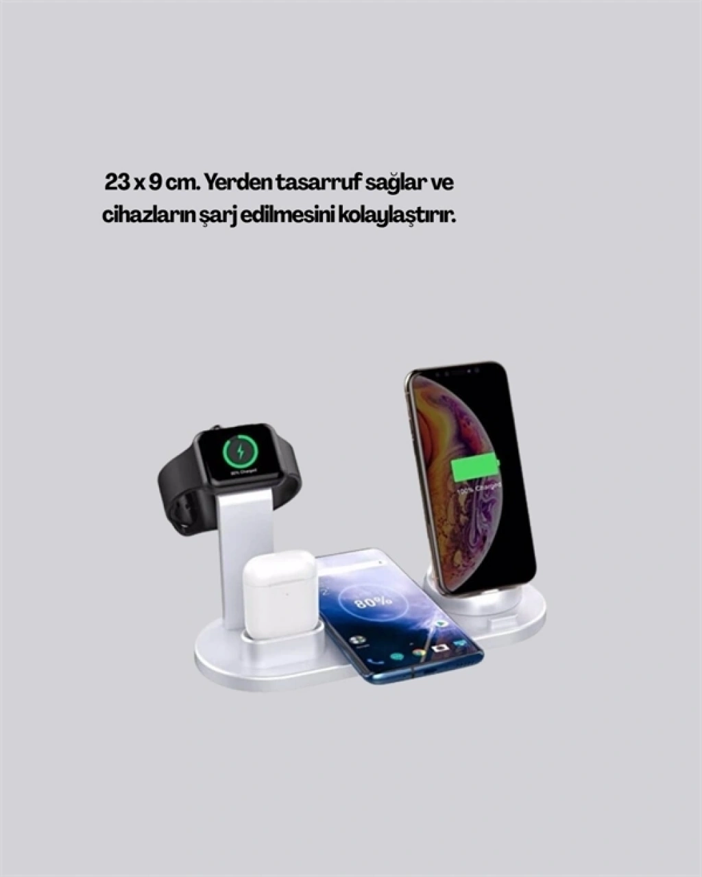Bu kablosuz şarj istasyonu, günümüzün çoklu cihaz kullanımına uygun olarak geliştirilmiş son derece pratik bir çözümdür. Aynı anda bir akıllı telefon, bir akıllı saat, bir kulaklık ve ekstra bir cihazı (Lightning, USB Type-C veya Micro USB çıkışlı) şarj etme kapasitesine sahiptir. Cihaz, kullanıcıya tam paket olarak sunulmaktadır: 1 adet şarj tabanı, 1,1 metre uzunluğunda dayanıklı şarj kablosu, Apple Watch için özel bir şarj standı ve detaylı şartname kılavuzu ile birlikte gelir.Farklı renk seçenekleriyle sunulan bu ürün, yalnızca teknolojik değil, es beklentilere de hitap eder. Üstelik kompakt yapısıyla evde, ofiste, seyahatte veya çalışma masasında az yer kaplayarak çok iş yapar. Akıllı cihazlarınızı şarj ederken aynı zamanda düzenli ve kablosuz bir ortam yaratır.