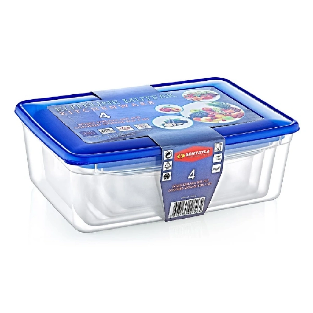 4'LÜ KÖŞELİ SAKLAMA KABI SETİÜrün ÖzellikleriMutfakta düzen ve hijyeni ön planda tutmak isteyenler için tasarlanan 4'lü Köşeli Saklama Kabı Seti, farklı hacimlere sahip dört ayrı kap ile geniş bir saklama kabı seti çözümü sunar. Set içerisinde 20x13,5x7 cm, 24x16,5x8,5 cm, 27,5x19,5x9,5 cm ve 30,5x22x10,5 cm ölçülerinde toplam dört adet kap yer alır. Şeffaf gövde tasarımı sayesinde içerisindeki gıdaları kolayca görmenizi sağlayan köşeli saklama kabı formu, dolap ve buzdolabında düzenli bir yerleşim imkânı sunar. Sızdırmaz mavi kapakları, gıdaların tazeliğini korumaya yardımcı olur ve hem buzdolabında hem de mutfak dolaplarında güvenle kullanılabilir. Dayanıklı ve BPA içermeyen plastik malzemeden üretilmiş olup gıda ile temasa uygundur. İç içe geçebilen yapısı sayesinde yer tasarrufu sağlar ve yemek, salata, kahvaltılık, meyve veya kuru gıdalar için hijyenik bir mutfak saklama çözümü sunar. Piknik, seyahat ve ofis kullanımı için de pratik bir alternatiftir.Ürün Teknik Özellikleri Özellik Açıklama Ürün Adı 4'lü Köşeli Saklama Kabı Seti Adet 4 Parça Set Ölçüler 20x13,5x7 cm / 24x16,5x8,5 cm / 27,5x19,5x9,5 cm / 30,5x22x10,5 cm Malzeme BPA içermeyen plastik Kullanım Alanı Buzdolabı ve mutfak dolabı kullanımı Paket İçeriği4 adet farklı boyutta köşeli saklama kabı
