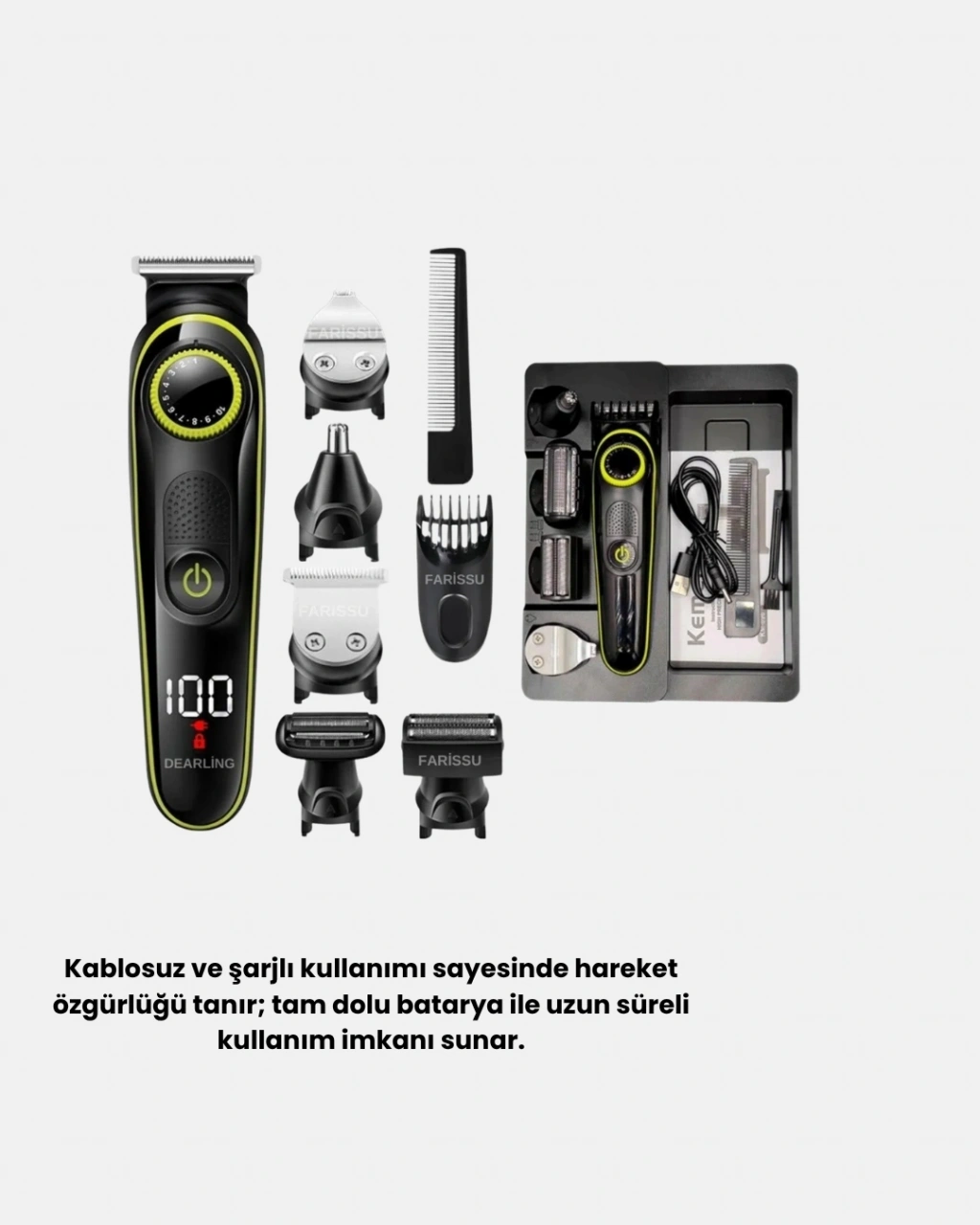 Kapsamlı bakım tek cihazda!Bu 5’i 1 Arada Şarjlı Erkek Bakım Seti, saç, sakal, burun ve kulak kılı temizliği ile vücut tıraşını kolayca yapmanıza imkan tanır.Güçlü motoru, paslanmaz çelik bıçakları ve ayarlanabilir başlıkları sayesinde her kullanımda profesyonel sonuçlar elde edersiniz.Kablosuz yapısı, sizi priz kısıtlamasından kurtarır.Uzun ömürlü bataryası, tek şarjla uzun süreli kullanım sunar.Üzerindeki LED gösterge, şarj durumunu anlık olarak bildirerek bakım rutininizi planlamayı kolaylaştırır.Ergonomik ve kompakt tasarımı, tutuş rahatlığı ve taşınabilirlik sağlar.Sessiz çalışma özelliği, evde, seyahatte veya ofiste fark edilmeyen bir kullanım deneyimi sunar.Suya dayanıklı bıçakları sayesinde temizliği pratik, kullanımı hijyeniktir.Bu çok fonksiyonlu bakım seti, modern erkeğin günlük bakım ihtiyacına profesyonel bir çözüm getirir.