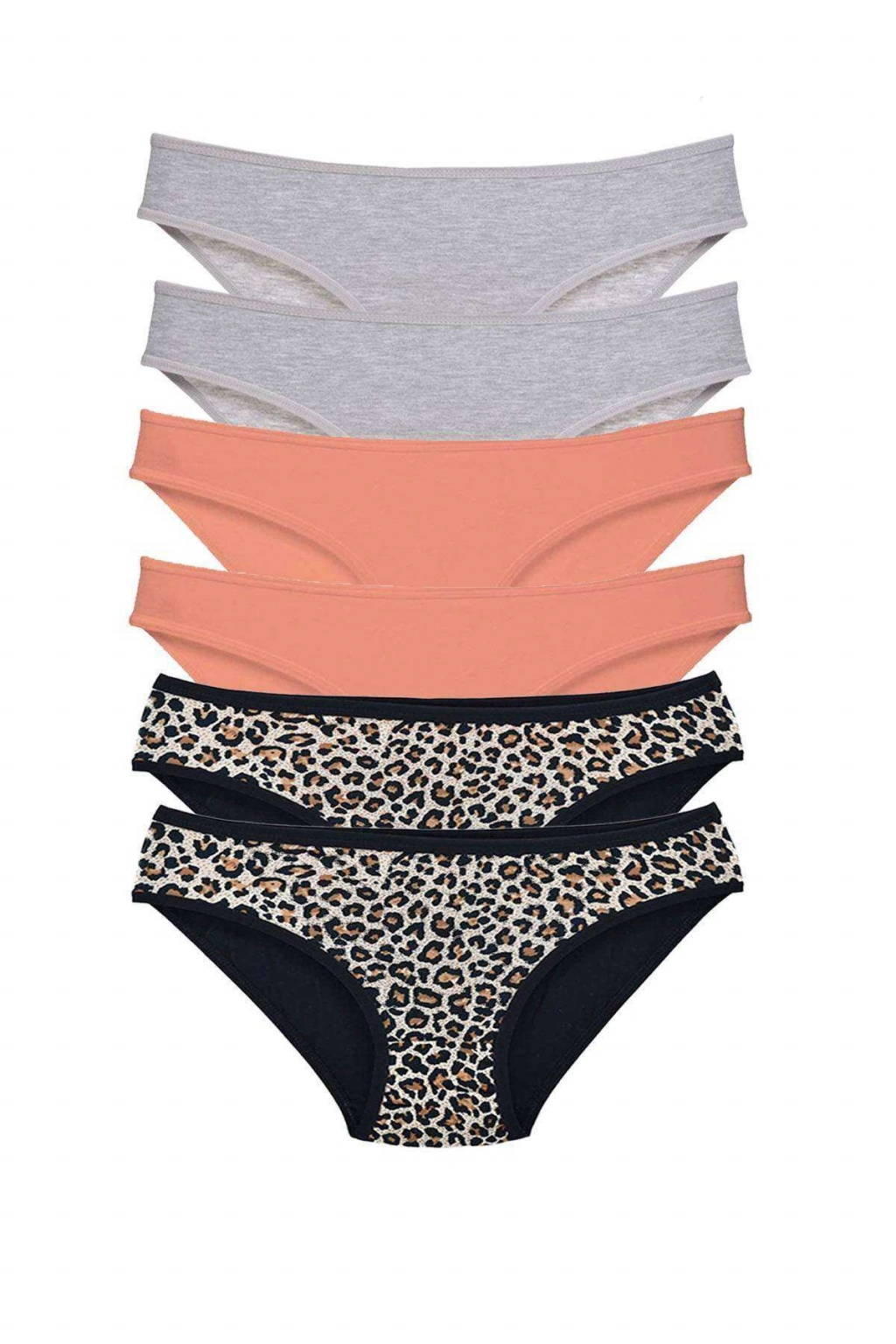 6 Adet Likralı Kadın Slip Külot Leopar Gri Pudra