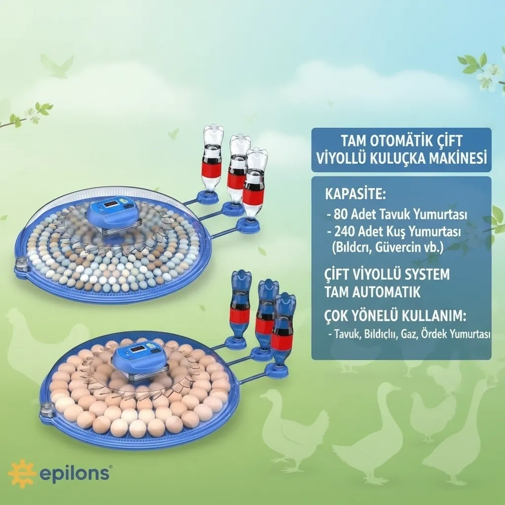 Epilons 80/240 Kapasiteli Çift Viyollü Kuluçka Makinesi, kazlar, ördekler, tavuklar, bıldırcınlar ve diğer kümes hayvanları için ideal bir seçenektir.