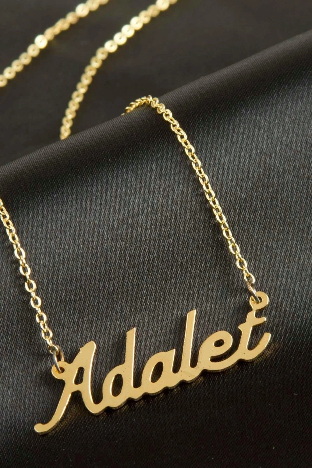 Adalet isimli kolye. İsimli kolye pirinç madeninden ve altın kaplamalıdır. Kişiye özel üretilmektedir.Yazdırmak istediğiniz ismi bize mesaj olarak iletmeniz gerekmektedir. Kullanıma bağlı olarak uzun süre kullanıma uygundur. Ürün malzemesi 1.sınıf kalitededir. Ürün ve zinciri sarı renktedir. Ürün zincir boyu 45 cm ve ürün üzerindeki isimler yaklaşık 3 cmdir. İsim boyları ürün ismine göre degişiklik göstermektedir.