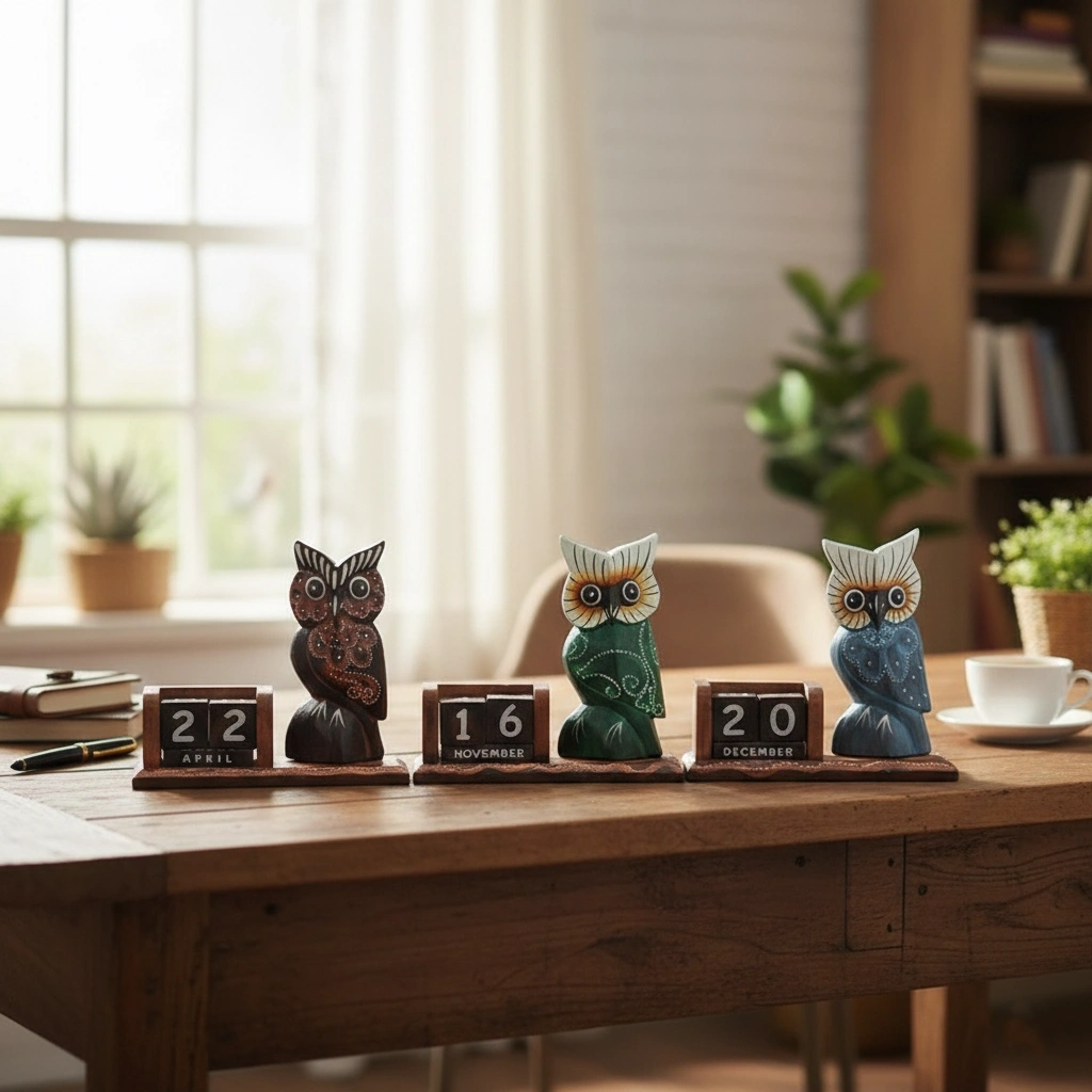 AHŞAP BAYKUŞ TAKVİM BÜYÜK BOYÜrün ÖzellikleriDoğal ahşaptan üretilen büyük boy baykuş figürlü takvim, 14x15 cm boyutundadır. El işçiliği ile tasarlanmış bu dekoratif takvim, masa üstü kullanım için şık ve işlevsel bir seçenektir. Gün, ay ve tarih blokları sayesinde her yıl tekrar kullanılabilir. Baykuş figürü ile sevimli ve estetik bir görünüm sunarak hem dekoratif hem de pratik bir masa aksesuarıdır. Ev, ofis veya hediye olarak ideal bir seçimdir.Paket İçeriği1 adet ahşap baykuş takvim (büyük boy).