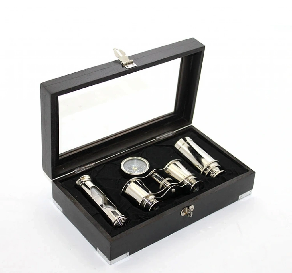 • Ahşap Kutulu Pirinç Dürbün Pusula Ve Kum Saati Seti