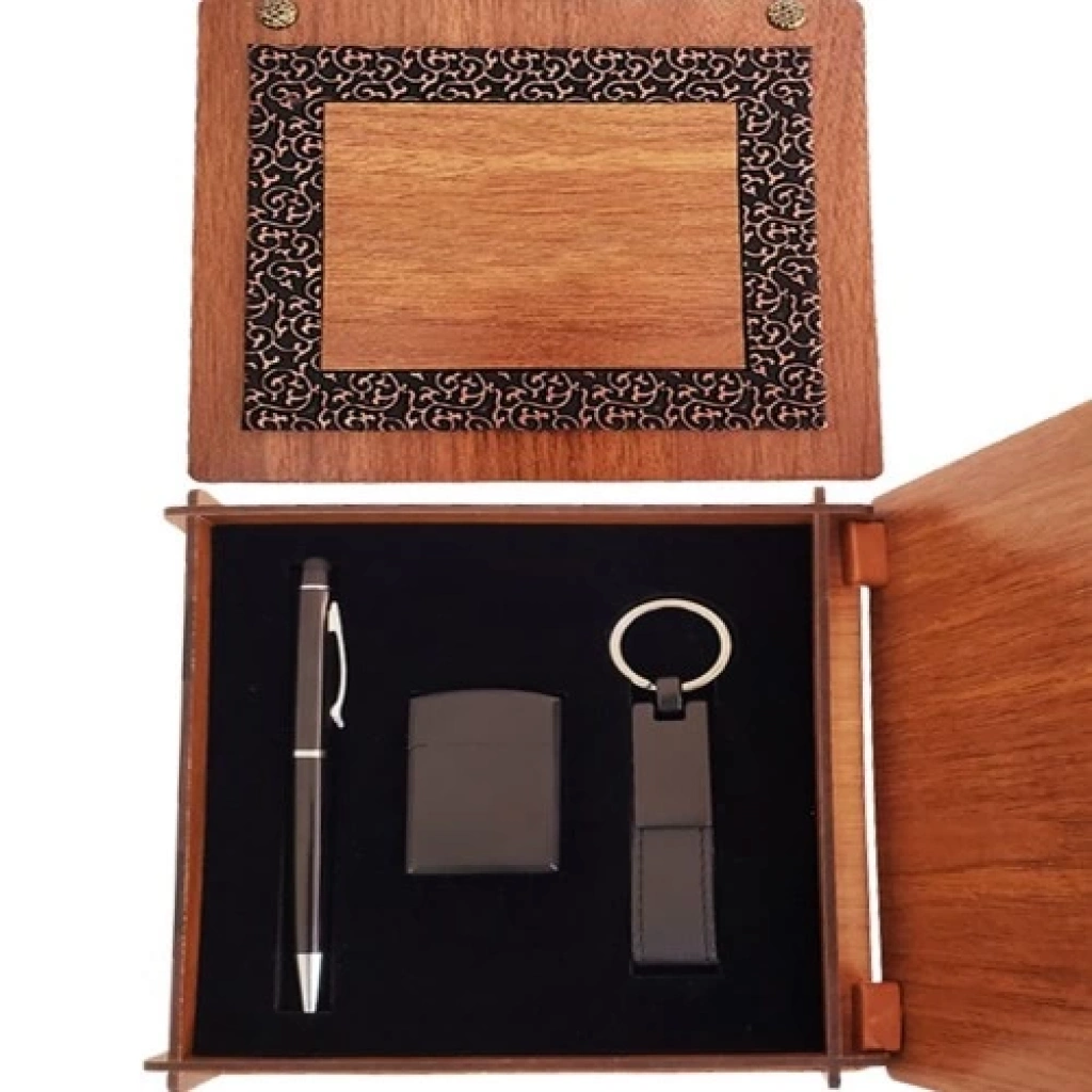 Ahşap Kutulu Siyah Kalem, Anahtarlık ve Mat Çakmak SetAhşap kutulu siyah kalem, deri anahtarlık ve mat çakmak seti, hem şık tasarımı hem de kaliteli malzemesi ile öne çıkan promosyon ve hediye ürünlerindendir. Toptan alımlar ve kişiye özel siparişler için uygundur. Lazer baskı, kazıma veya markalama ile tamamen kişiselleştirilebilir.Özel ahşap kutusu sayesinde seti dilediğiniz gibi süsleyebilir ve içine küçük hediyeler ekleyebilirsiniz. Siyah kalem ve deri anahtarlık uyumu, mat çakmak ile bir araya gelerek şık ve işlevsel bir hediye sunar. İş yerinde, ofiste veya özel günlerde promosyon amaçlı kullanım için idealdir.ÖzelliklerKaliteli siyah kalem ve deri anahtarlıkMat çakmak dahilÖzel ahşap kutuda sunulur, dekoratif ve şık tasarımKişiye özel lazer baskı, kazıma veya markalama yapılabilirToptan alımlar ve promosyonlar için idealKutunun içine küçük hediyeler eklenebilir