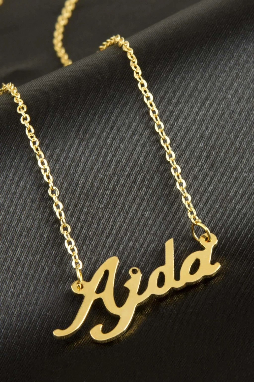 Ajda isimli kolye. İsimli kolye pirinç madeninden ve altın kaplamalıdır. Kişiye özel üretilmektedir.Yazdırmak istediğiniz ismi bize mesaj olarak iletmeniz gerekmektedir. Kullanıma bağlı olarak uzun süre kullanıma uygundur. Ürün malzemesi 1.sınıf kalitededir. Ürün ve zinciri sarı renktedir. Ürün zincir boyu 45 cm ve ürün üzerindeki isimler yaklaşık 3 cmdir. İsim boyları ürün ismine göre degişiklik göstermektedir.