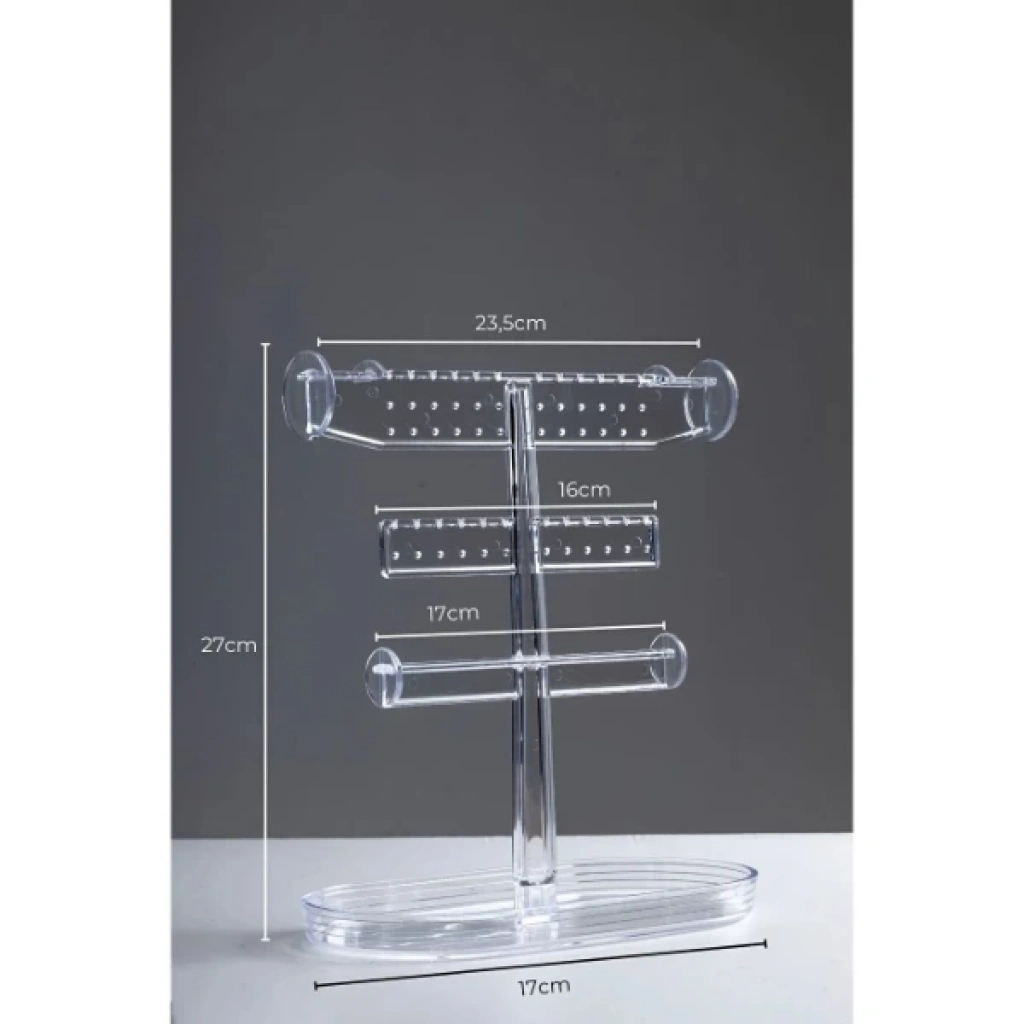 AKSESUAR STANDI TAKI ORGANIZERÜrün ÖzellikleriAksesuar standı takı organizer, şık ve fonksiyonel tasarımıyla küpe, kolye, bileklik ve yüzüklerinizi düzenli bir şekilde sergilemenizi sağlar. 23,5 cm üst genişlik, 16 cm orta kısım ve 17 cm alt genişliği ile farklı boyutlardaki takılar için ideal kullanım sunar. Toplam yüksekliği 27 cm olan bu stand, şeffaf ve dayanıklı plastikten üretilmiştir. Hem evde hem de mağaza vitrinlerinde kullanılabilir. Takılarınızın dolaşmasını önler ve düzenli bir görünüm elde etmenizi sağlar.Paket İçeriği1 adet Aksesuar Standı Takı Organizer