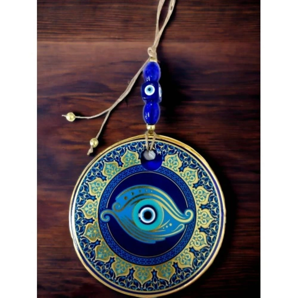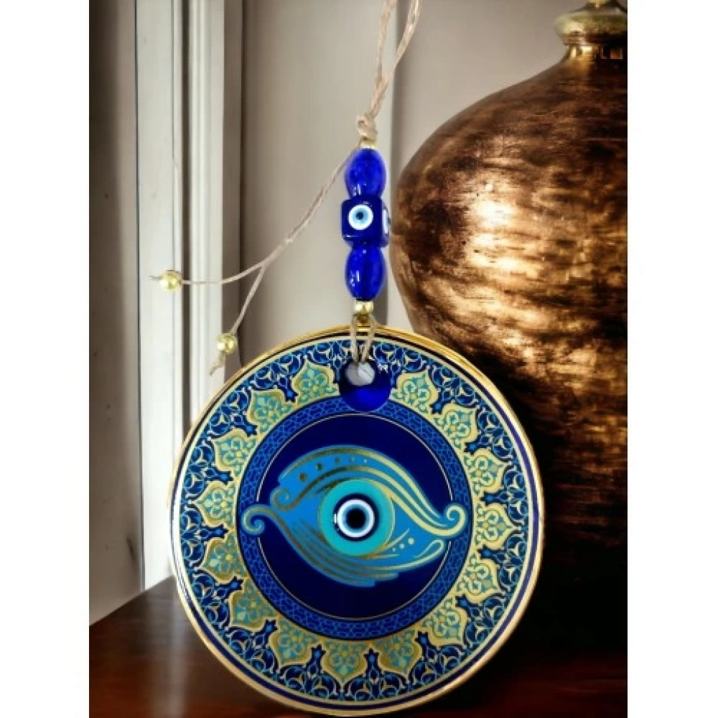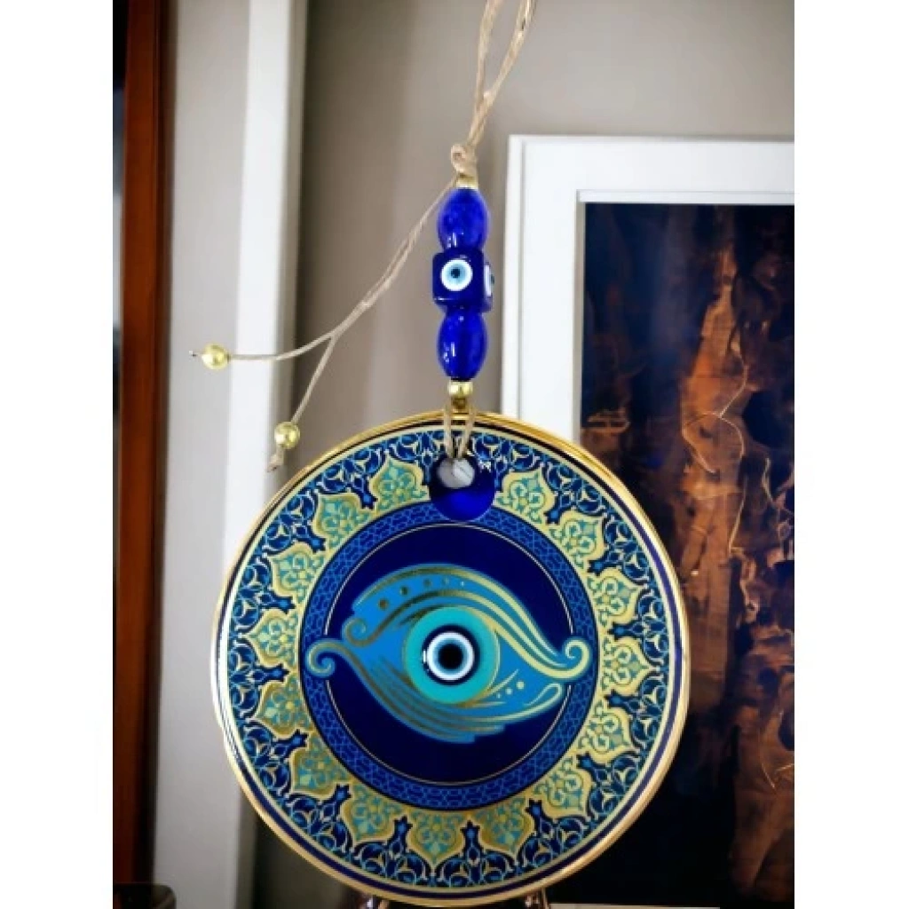 Nazar boncuklu göz duvar süsümüz nazar boncuğu ile süslenmiştir. Ürünümüz mavi cam nazar boncuğundan tamamen el işçiliği ile üretilmiştir. Ürünümüzün yuvarlak kısmı 13 santimetre çapındadır. Duvar süsümüz ip dahil yaklaşık 30 santimetre boyundadır.El yapımı füzyon cam sanatının en güzel örneklerinden biri olan balık gözü desenli nazarlık, kötü gözlerden korunmak isteyenler için ideal bir seçenek. Duvarınıza asarak evinizde pozitif bir enerji oluşturabilirsiniz.