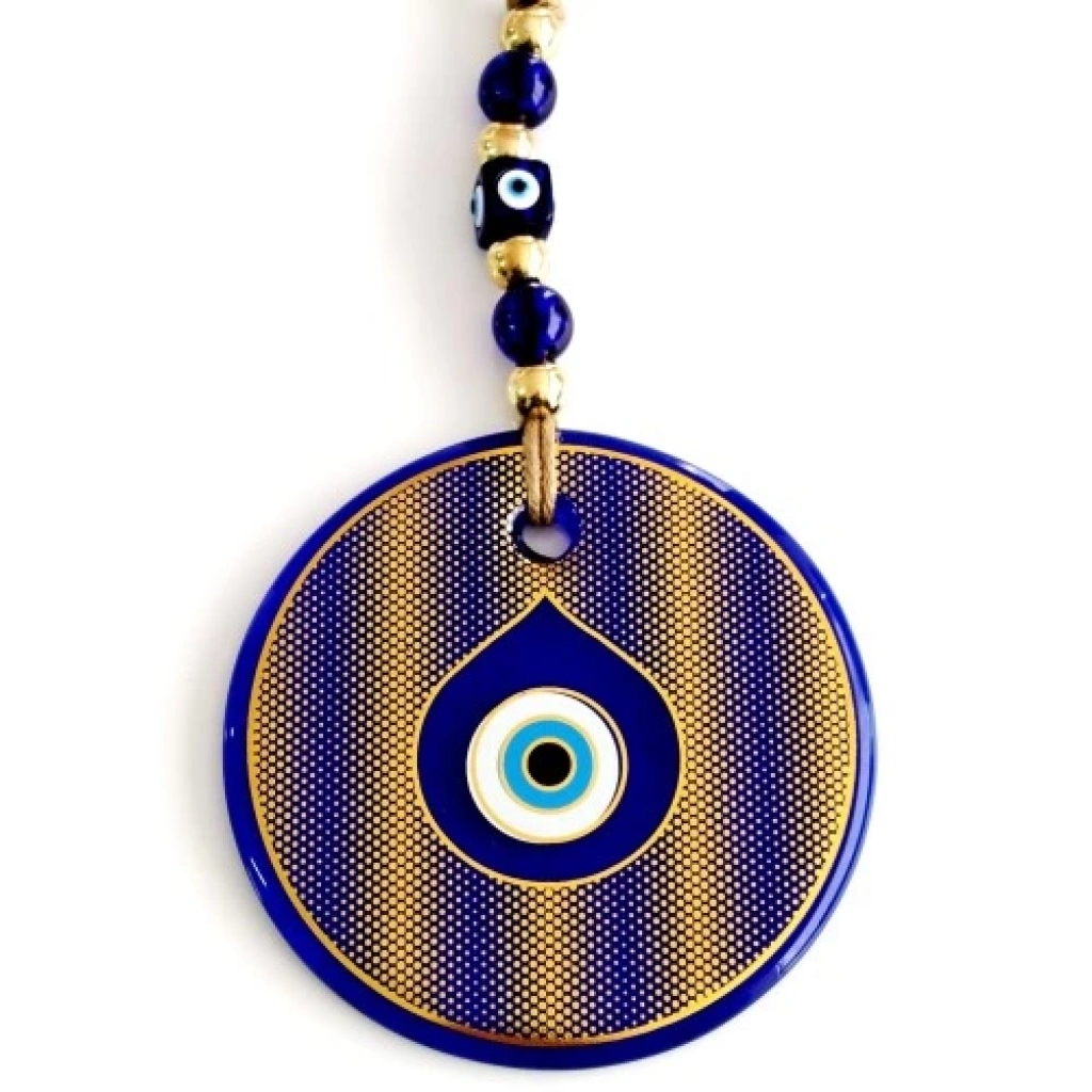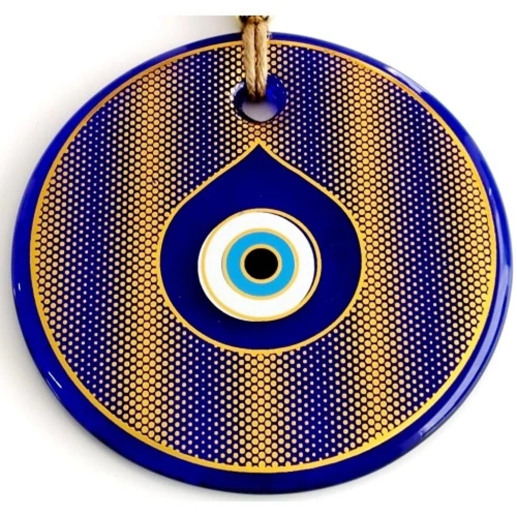 Altın sarısı yaldızlı ürünümüz cam malzemeden üretilmektedir. Ürünümüzün üzerinde damla göz deseni bulunmaktadır. Ürünümüzün cam kısmı 13 santimetre çapındadır. Ürünümüz ip dahil 30 santimetre boyundadır.El yapımı füzyon cam sanatının en güzel örneklerinden biri olan damla gözlü nazarlık, kötü gözlerden korunmak isteyenler için ideal bir seçenek. Duvarınıza asarak evinizde pozitif bir enerji oluşturabilirsiniz.