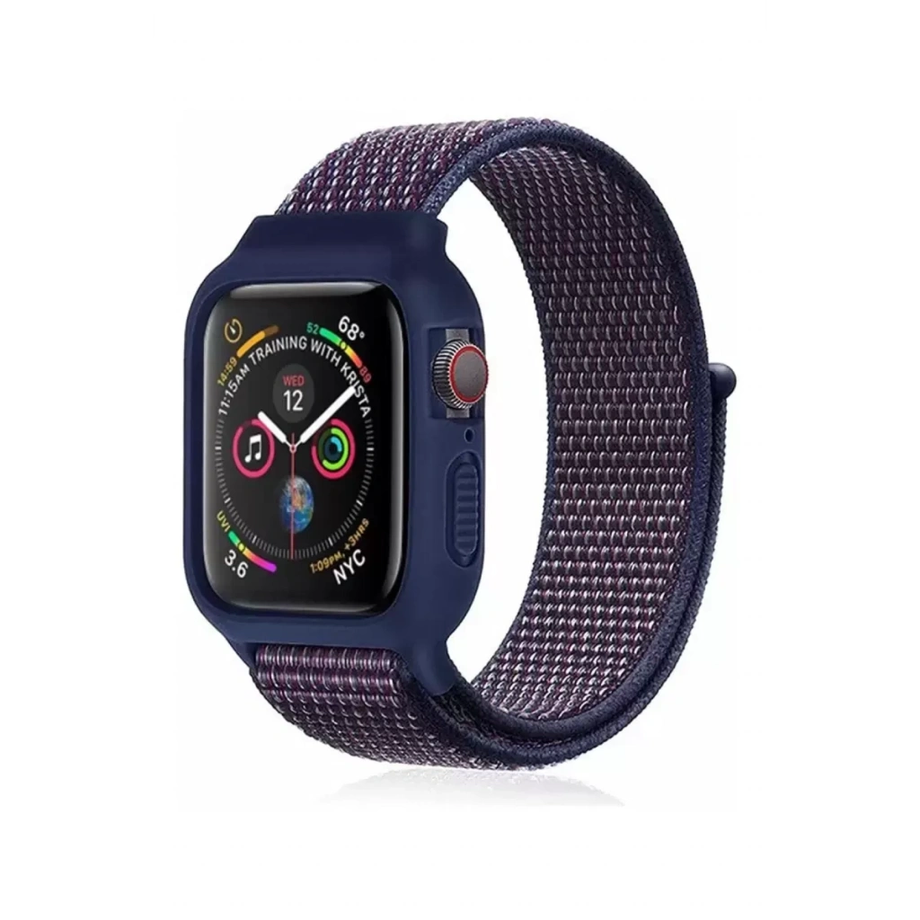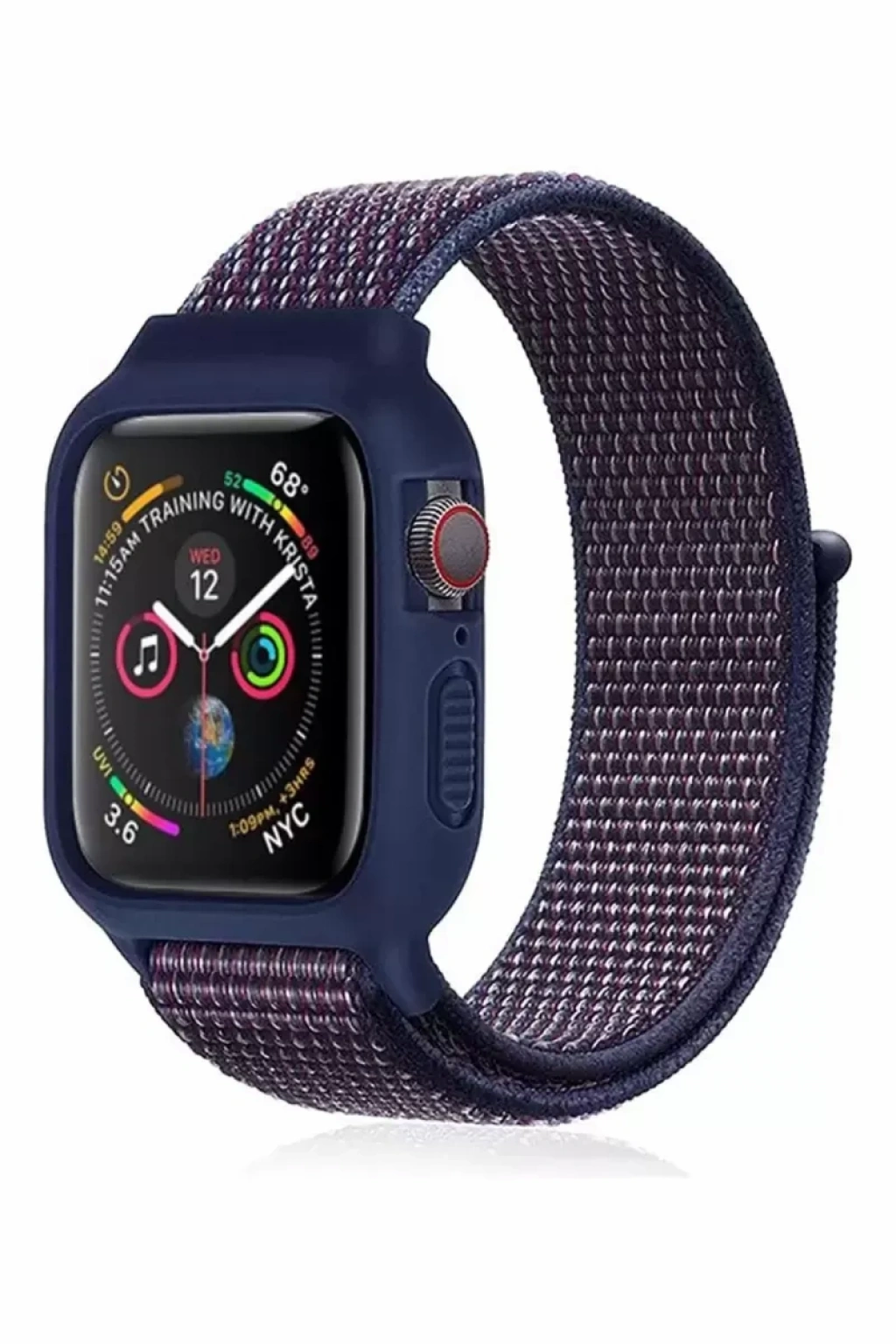 Apple Watch 38mm Hasırlı Cırtcırtlı Kasalı Kordon - Lacivert-Mürdüm