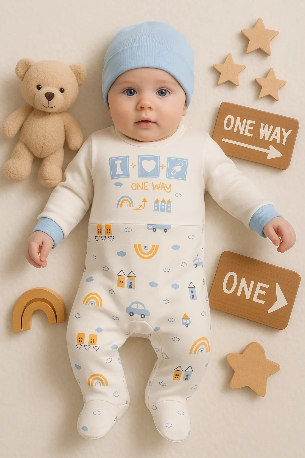 Araba Desenli Mavi 2'li Şapkalı Erkek Bebek Tulumu