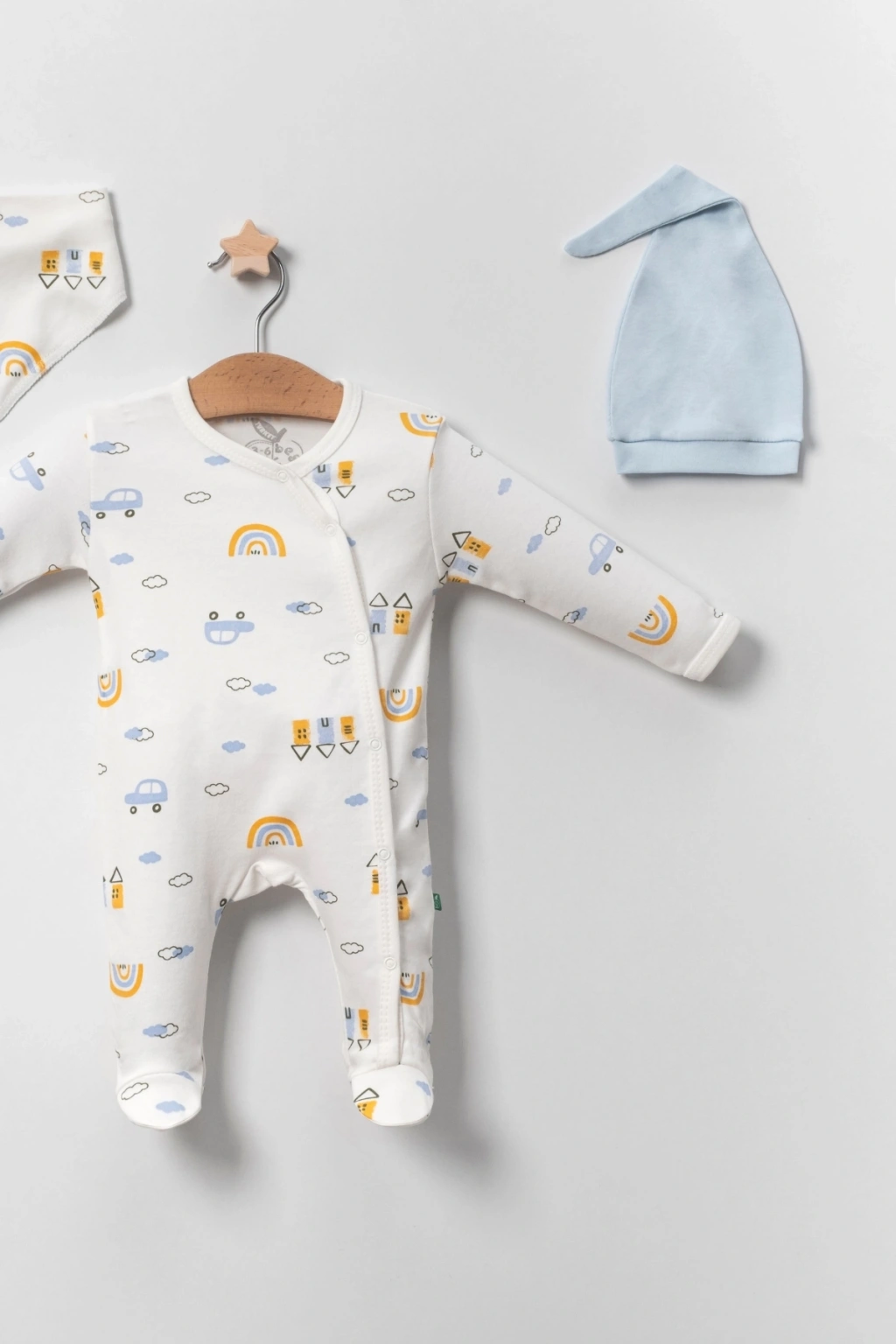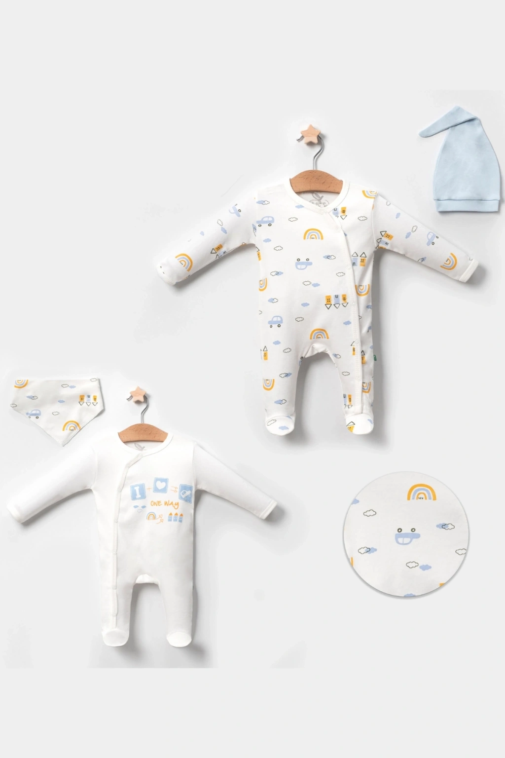 Araba Desenli Mavi 2'li Şapkalı Erkek Bebek Tulumu