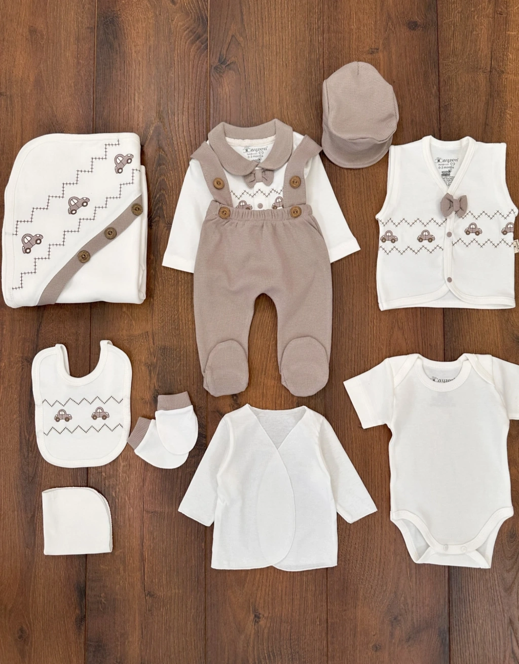 Araba Desenli Papyonlu 10 Parça Erkek Bebek Hastane Çıkışı Kutulu %100 Pamuk