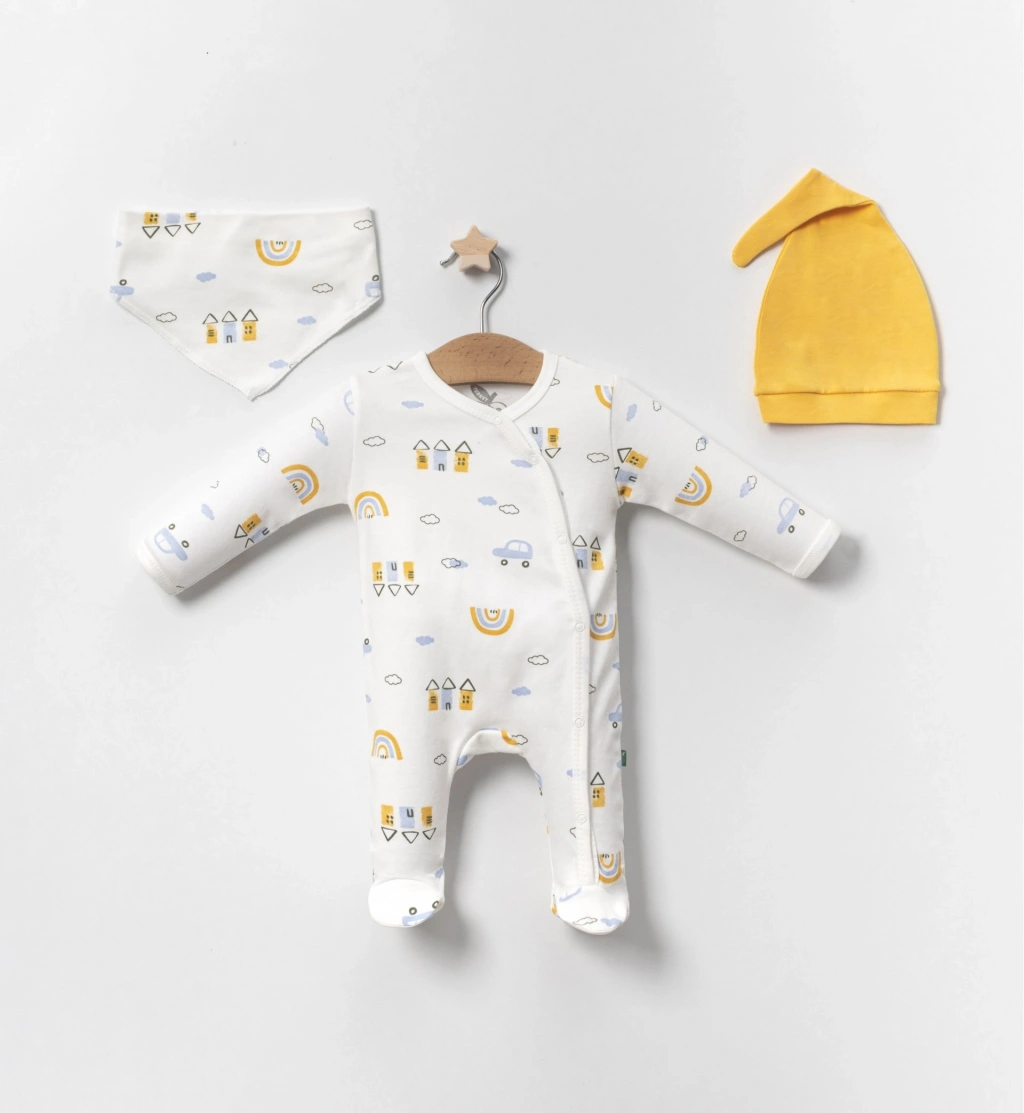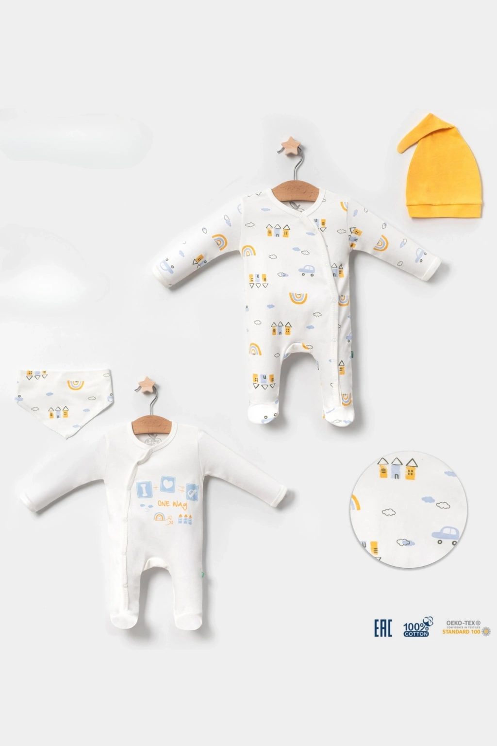 Araba Desenli Sarı 4'lü Erkek Bebek Tulumu