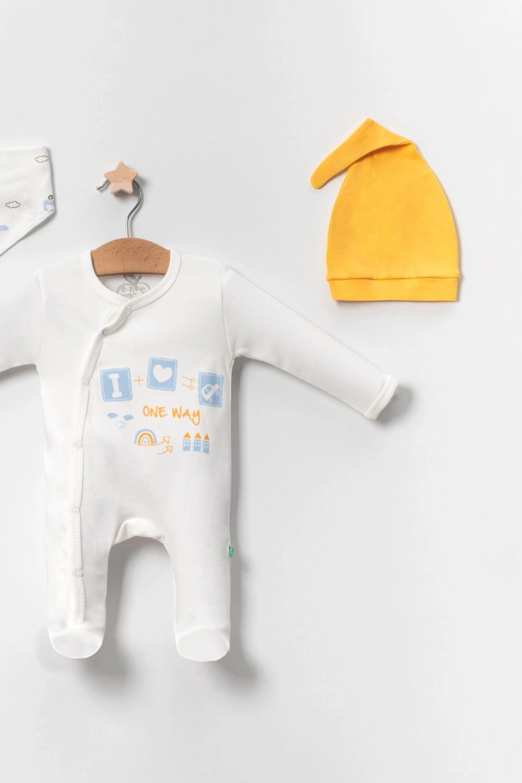 Araba Desenli Sarı 2'li Şapkalı Erkek Bebek Tulumu
