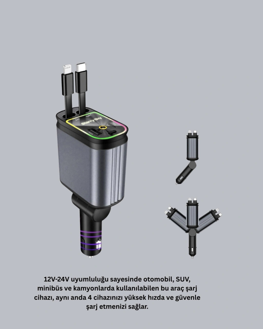 Yolda geçirdiğiniz zamanı daha verimli hale getirin! Araç Şarj Cihazı 66W 4 Portlu Hızlı Şarj ve LED Işıklı, güçlü performansı ve modern tasarımıyla araç içi şarj deneyimini yeniden tanımlıyor.66W toplam güç çıkışı ile aynı anda dört cihazınızı yüksek hızda şarj edebilir, telefon, tablet, akıllı saat veya kulaklıklarınızı güvenle enerjiyle buluşturabilirsiniz.PD (Power Delivery) ve QC (Quick Charge) teknolojileri sayesinde cihazlarınıza en uygun akımı otomatik olarak iletir, böylece pil sağlığını korurken hızlı şarj imkânı sunar.Çekilebilir kablo tasarımı (80 cm’ye kadar uzayabilir) sayesinde kablo karmaşasına son verir ve aracınızda düzenli bir görünüm sağlar.180 derece dönebilen başlık, farklı araç modellerine ve priz konumlarına uyum sağlar. Sallantılarda gevşeme yapmaz, sabit ve güvenli bir bağlantı sunar.LED atmosfer ışıkları, sadece es bir görünüm kazandırmakla kalmaz, aynı zamanda gece sürüşlerinde kullanım kolaylığı sağlar.12V-24V geniş uyumluluk özelliği sayesinde otomobil, SUV, minibüs ve kamyonlarda kullanılabilir. Kompakt ve dayanıklı yapısı uzun ömürlü kullanım sunar.Şık tasarımı, yüksek performansı ve pratik özellikleriyle Araç Şarj Cihazı 66W 4 Portlu Hızlı Şarj ve LED Işıklı, her yolculukta vazgeçilmez bir yardımcıdır!